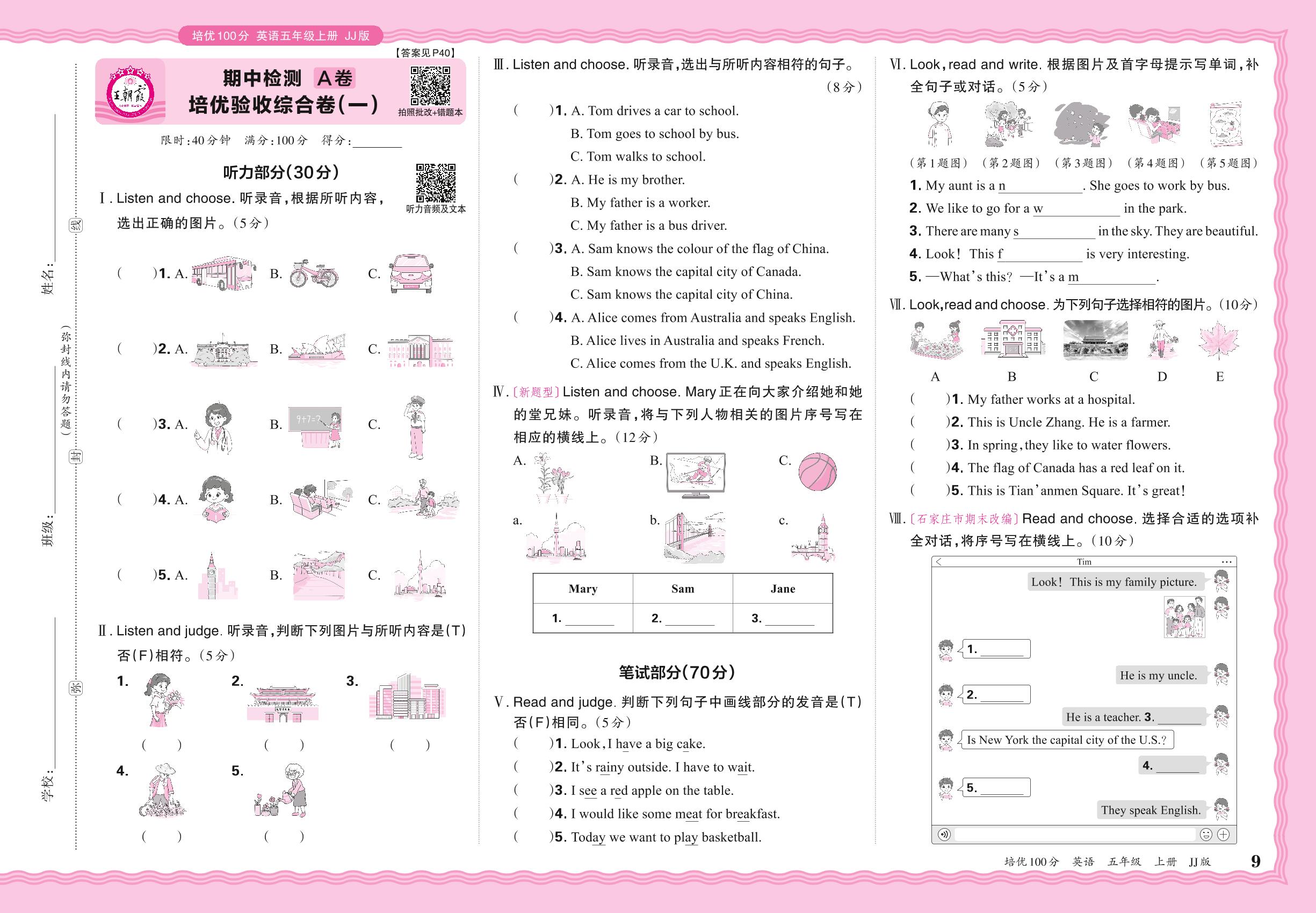 2024秋上册五年级英语冀教版 期中检测A卷 培优验收综合卷(一)