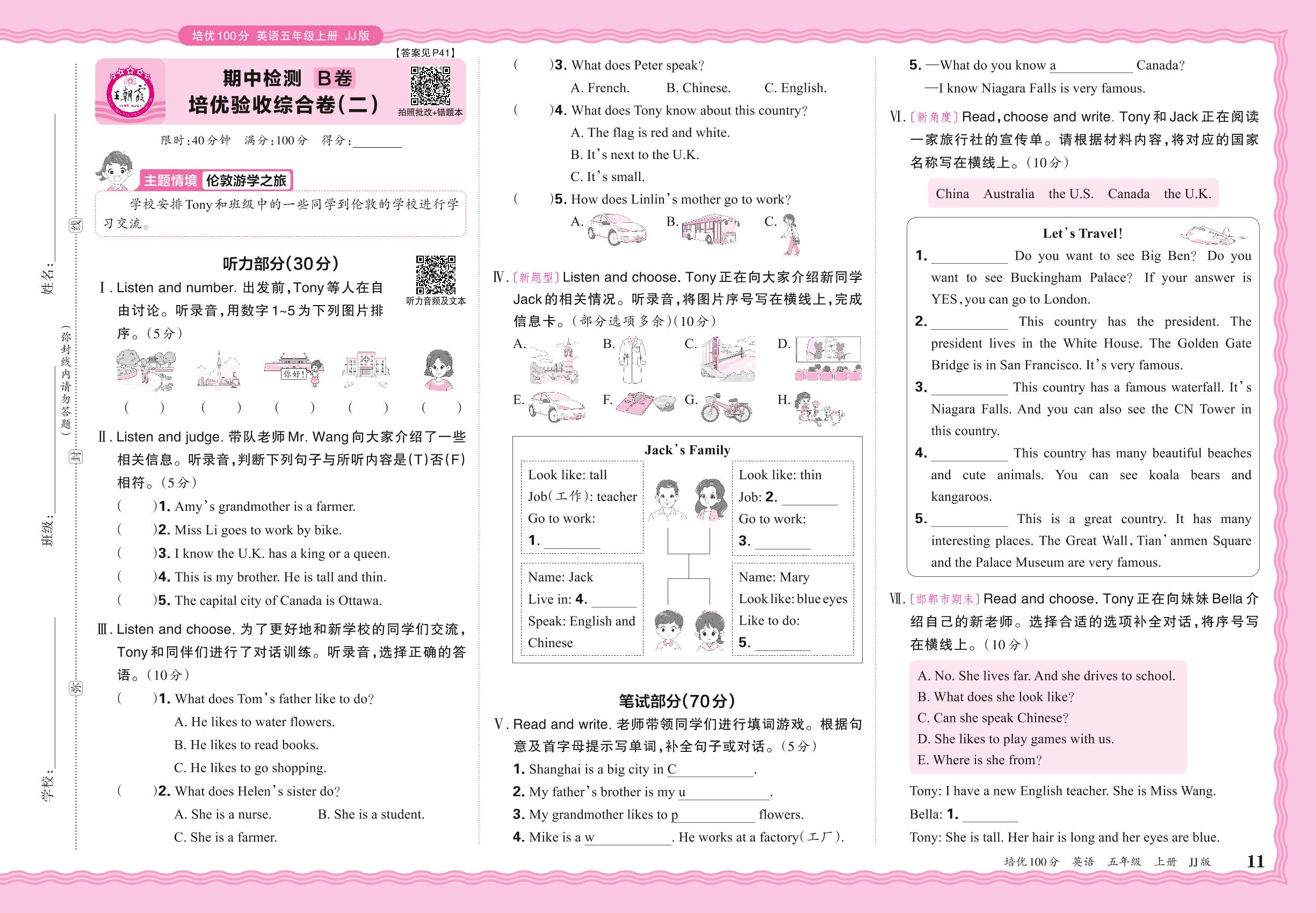2024秋上册五年级英语冀教版 期中检测B卷 培优验收综合卷(二)