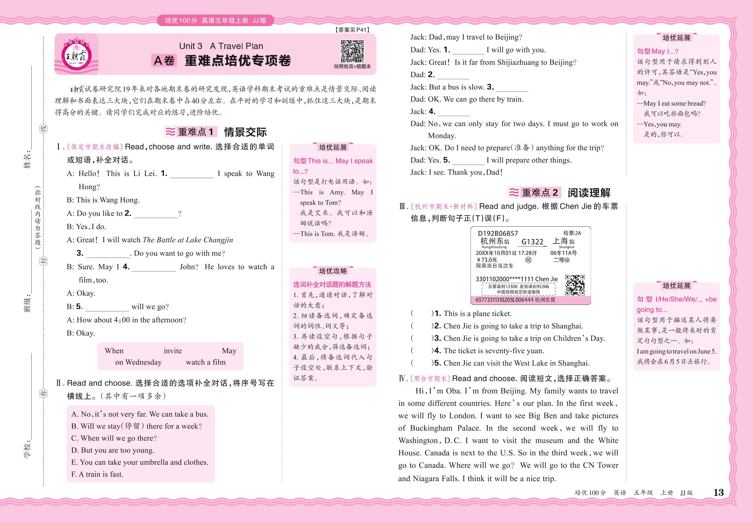 2024秋上册五年级英语冀教版 Unit 3 A卷 重难点培优专项卷