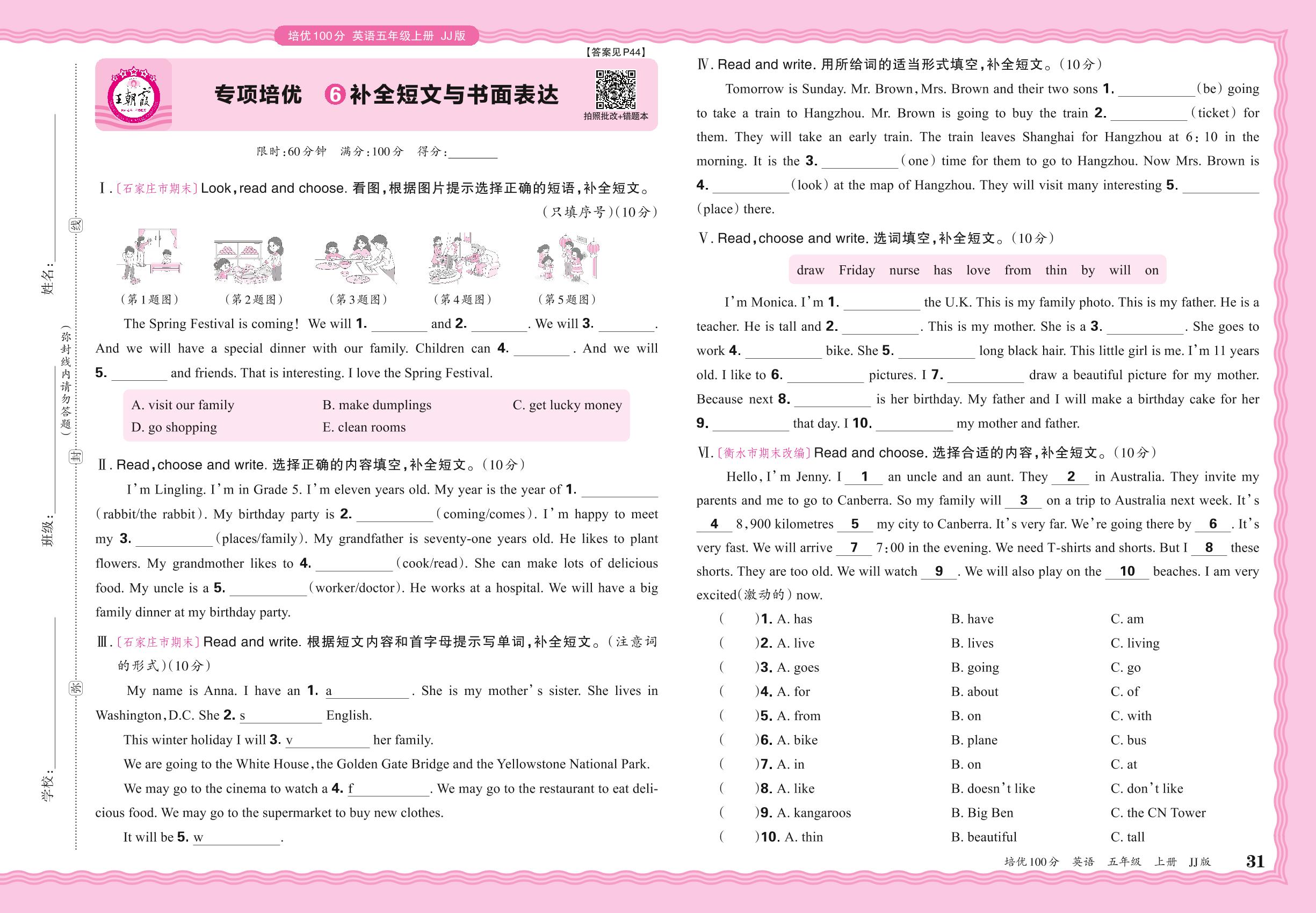 2024秋上册五年级英语冀教版 期末专项卷PY版·补全短文与书面表达【6】