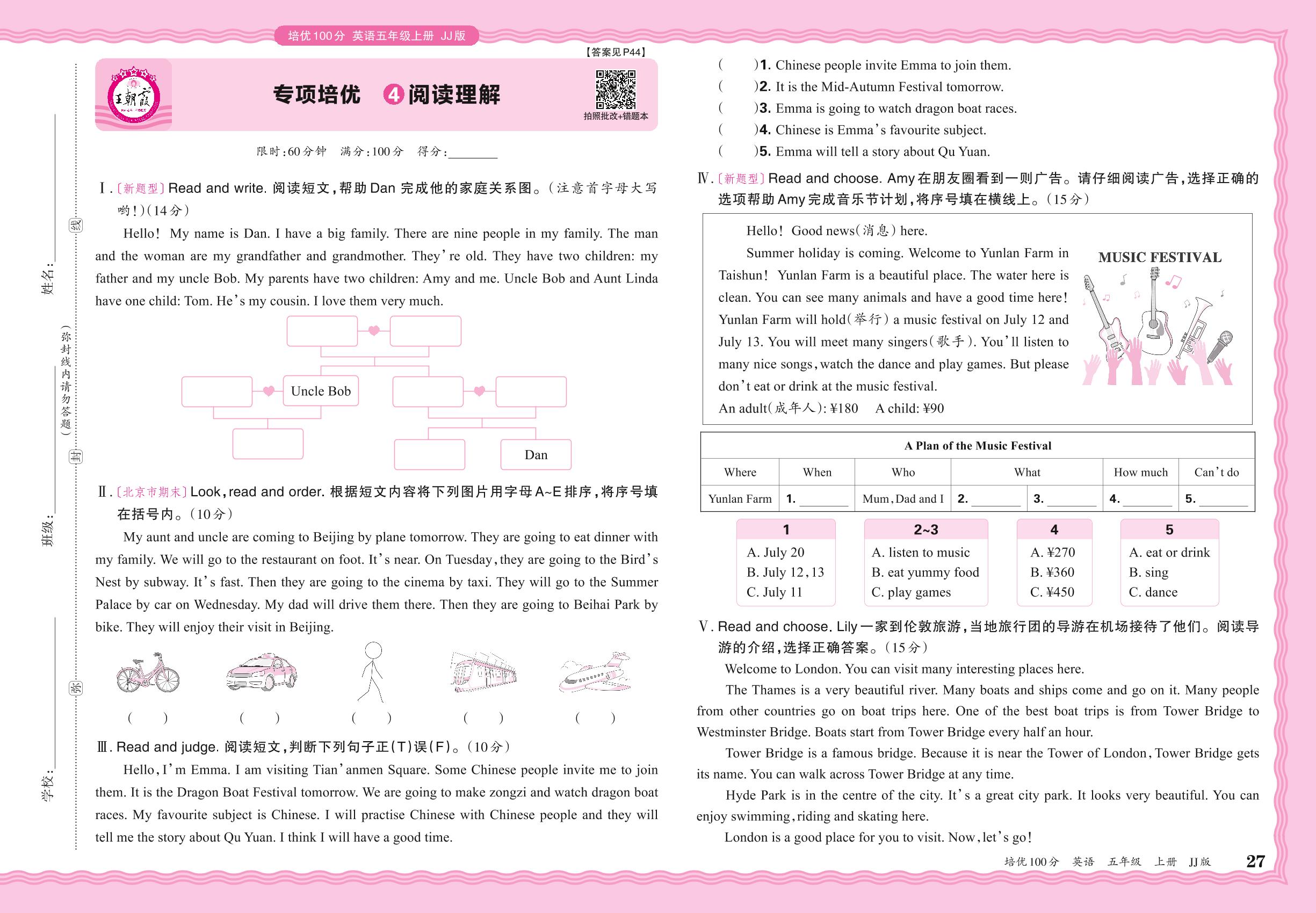 2024秋上册五年级英语冀教版 期末专项卷PY版·阅读理解【4】