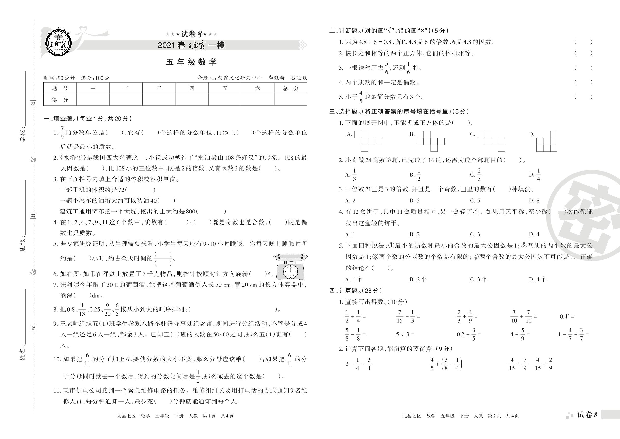 王朝霞期末模拟卷五年级下册数学(人教版)_R210804162536【8】