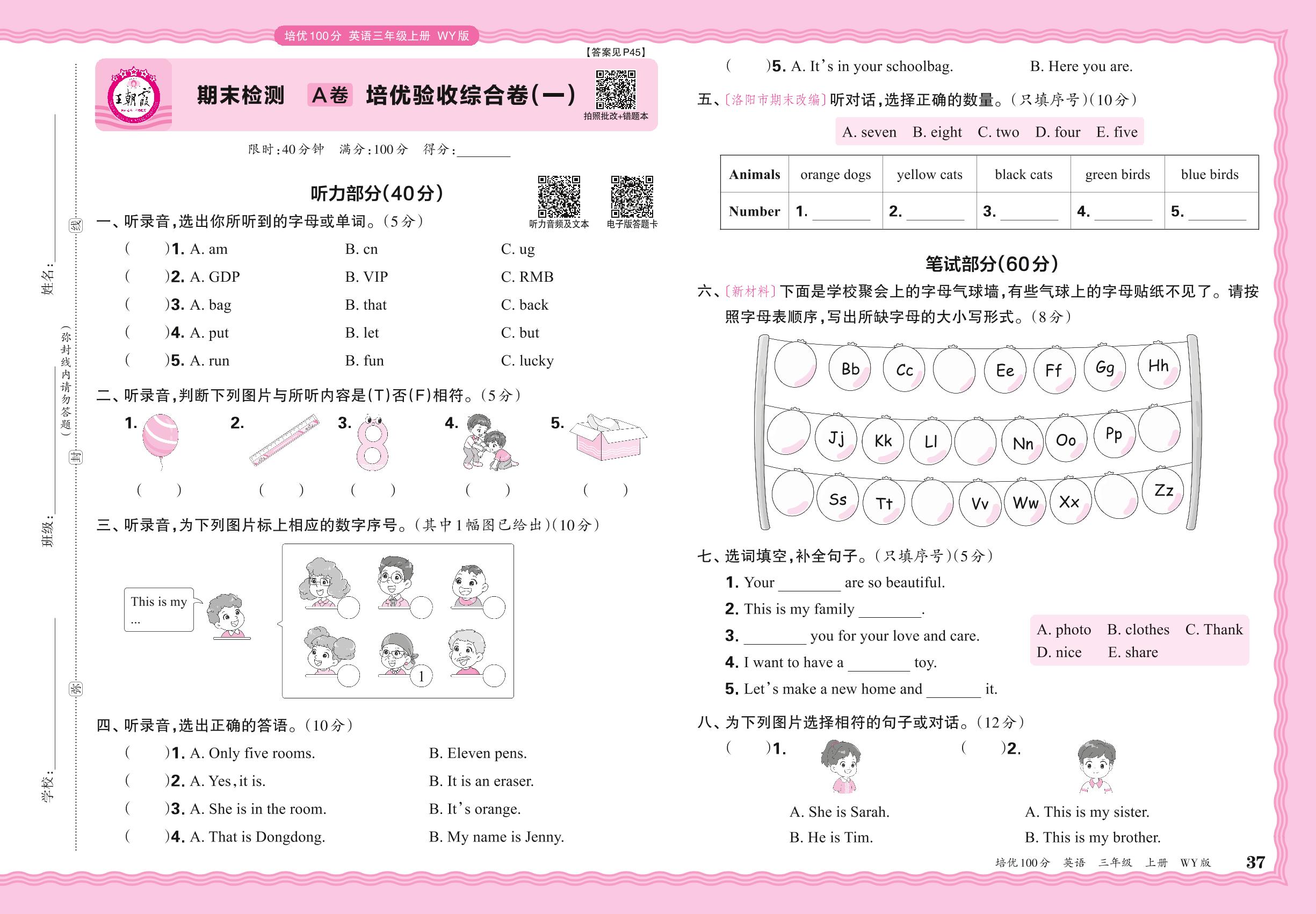 2024秋上册三年级英语外研版(三起始) 期末检测A卷 培优验收综合卷(一)