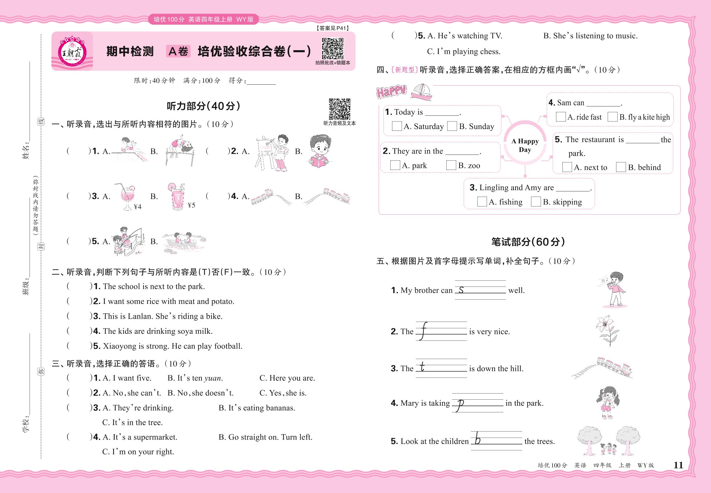 2024秋上册四年级英语外研版(三起始) 期中检测A卷 培优验收综合卷(一)