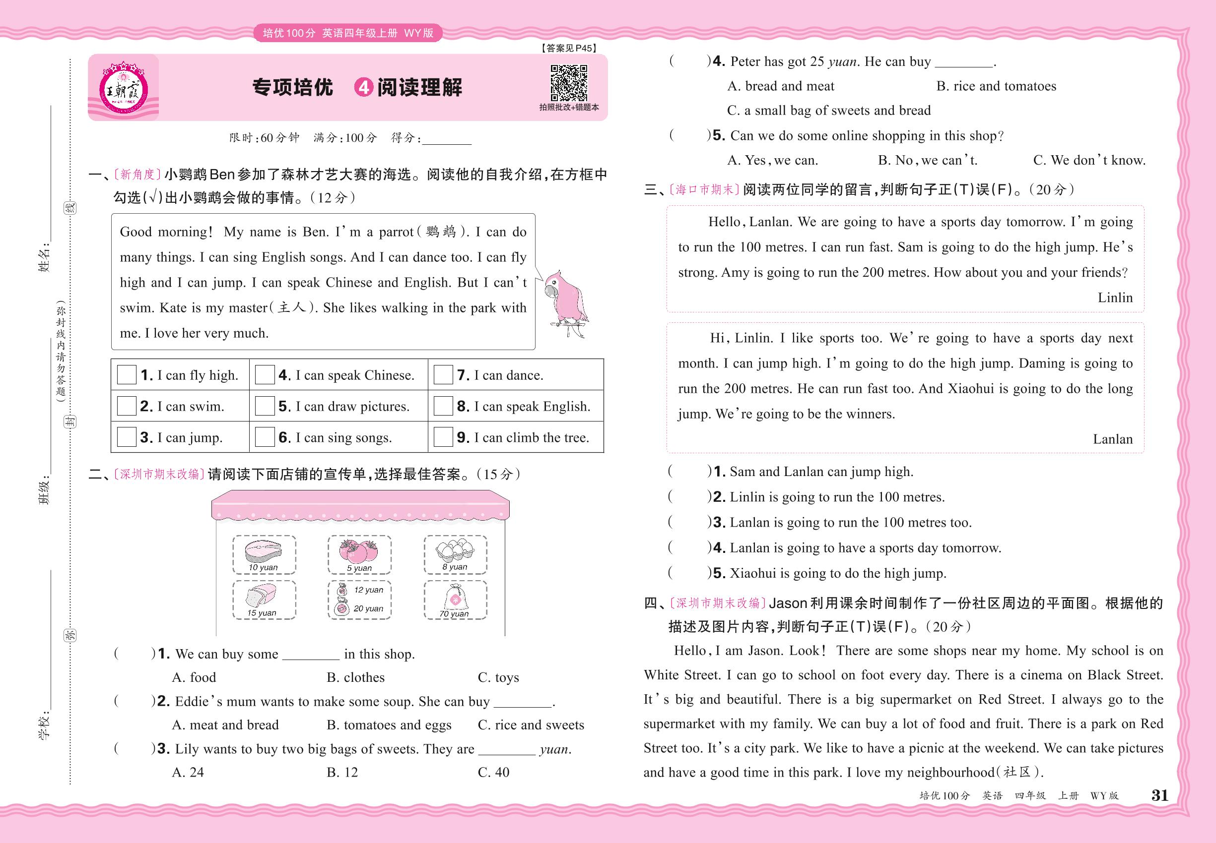 2024秋上册四年级英语外研版(三起始) 期末专项卷PY版·阅读理解【4】