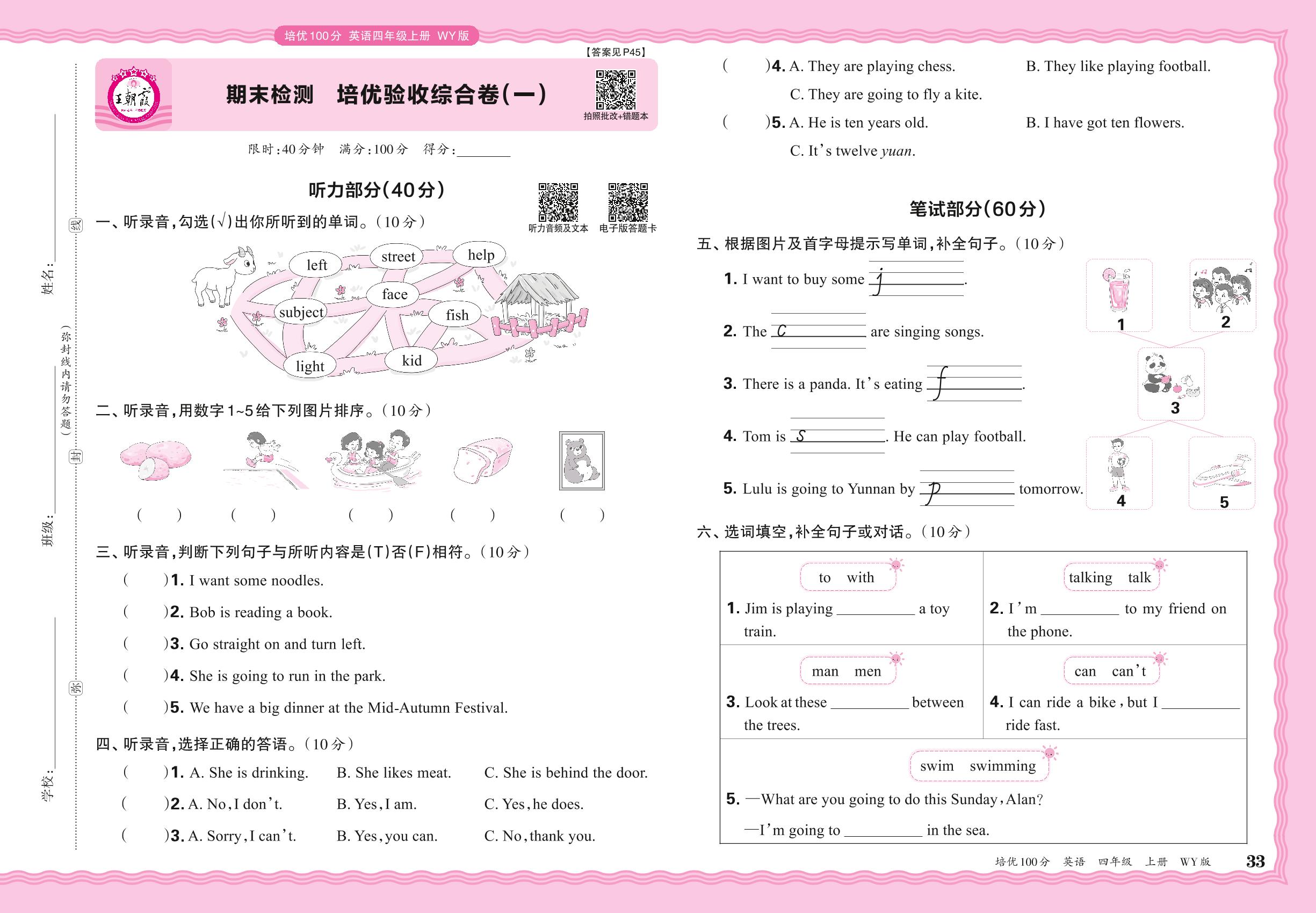 2024秋上册四年级英语外研版(三起始) 期末检测 培优验收综合卷(一)