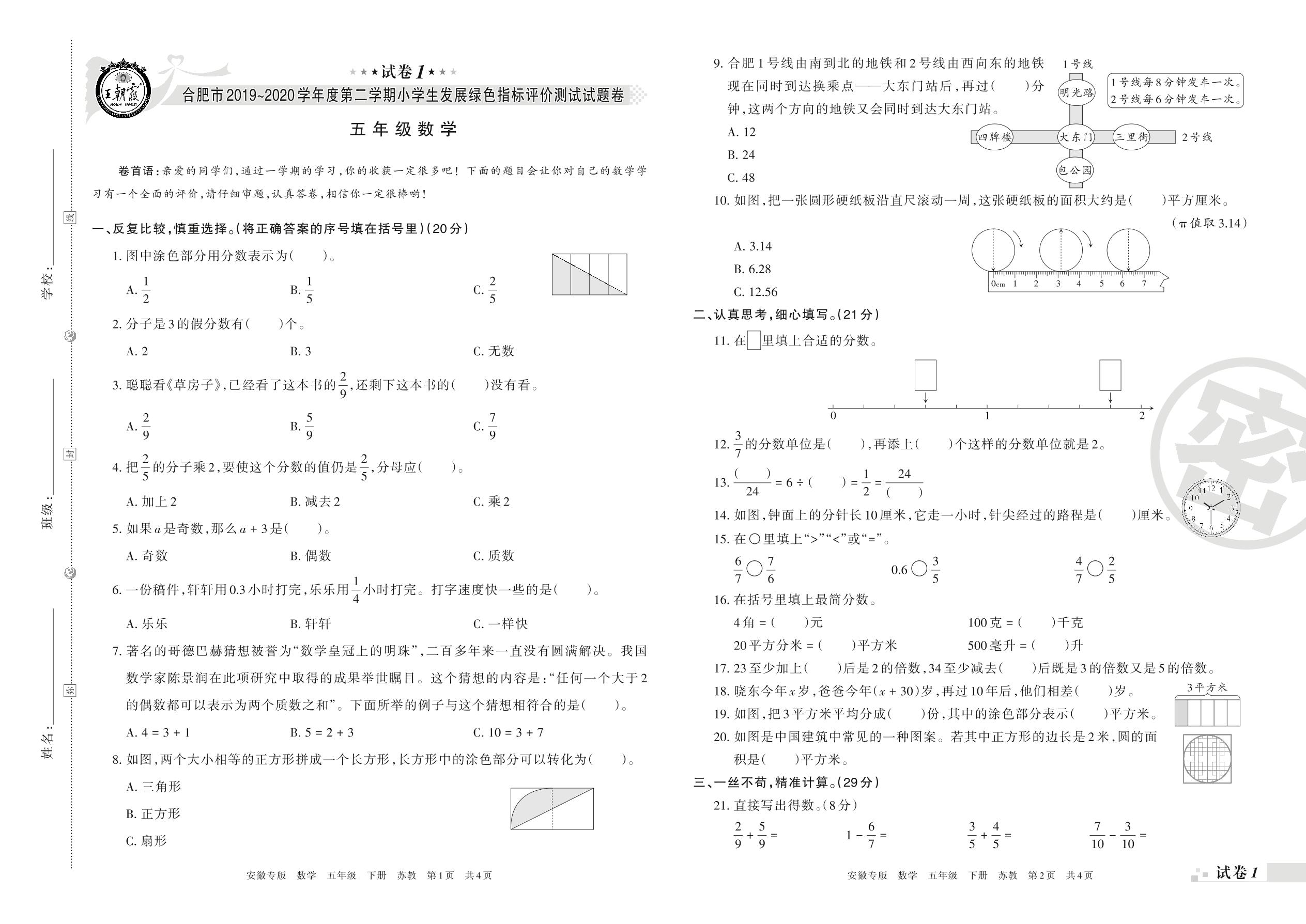 2019-2020学年第二学期合肥市五年级数学试卷(苏教版)【1】