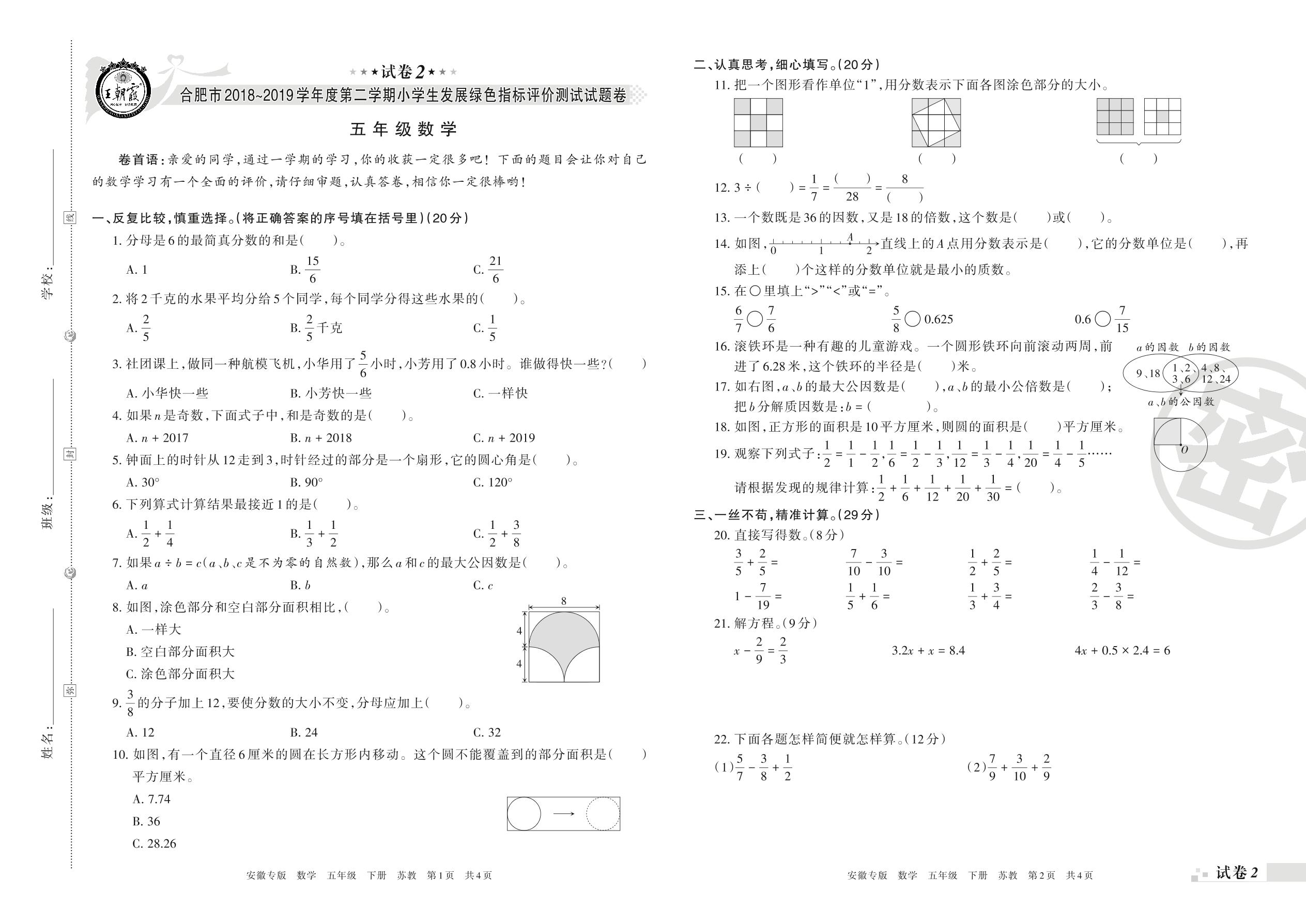 2018-2019学年第二学期合肥市五年级数学试卷(苏教版)【2】