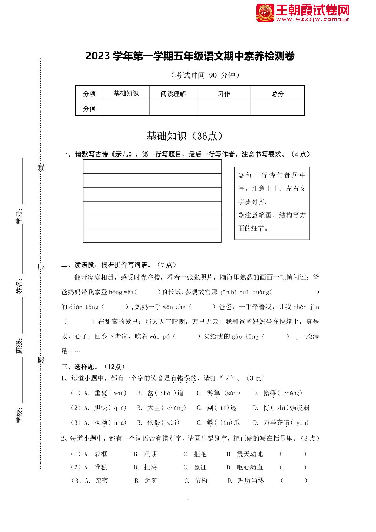 浙江省杭州市萧山区2023-2024学年第一学期期中素养检测卷五年级语文(人教版)