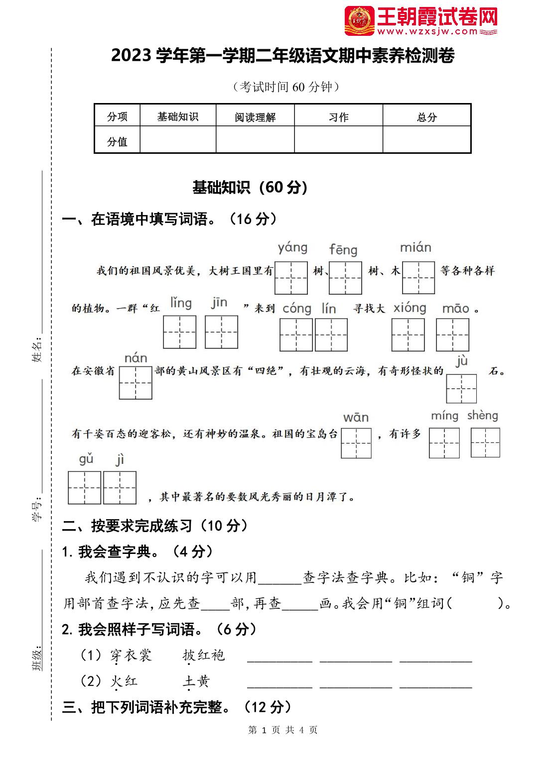 浙江省杭州市萧山区2023-2024学年第一学期期中素养检测卷二年级语文(人教版)