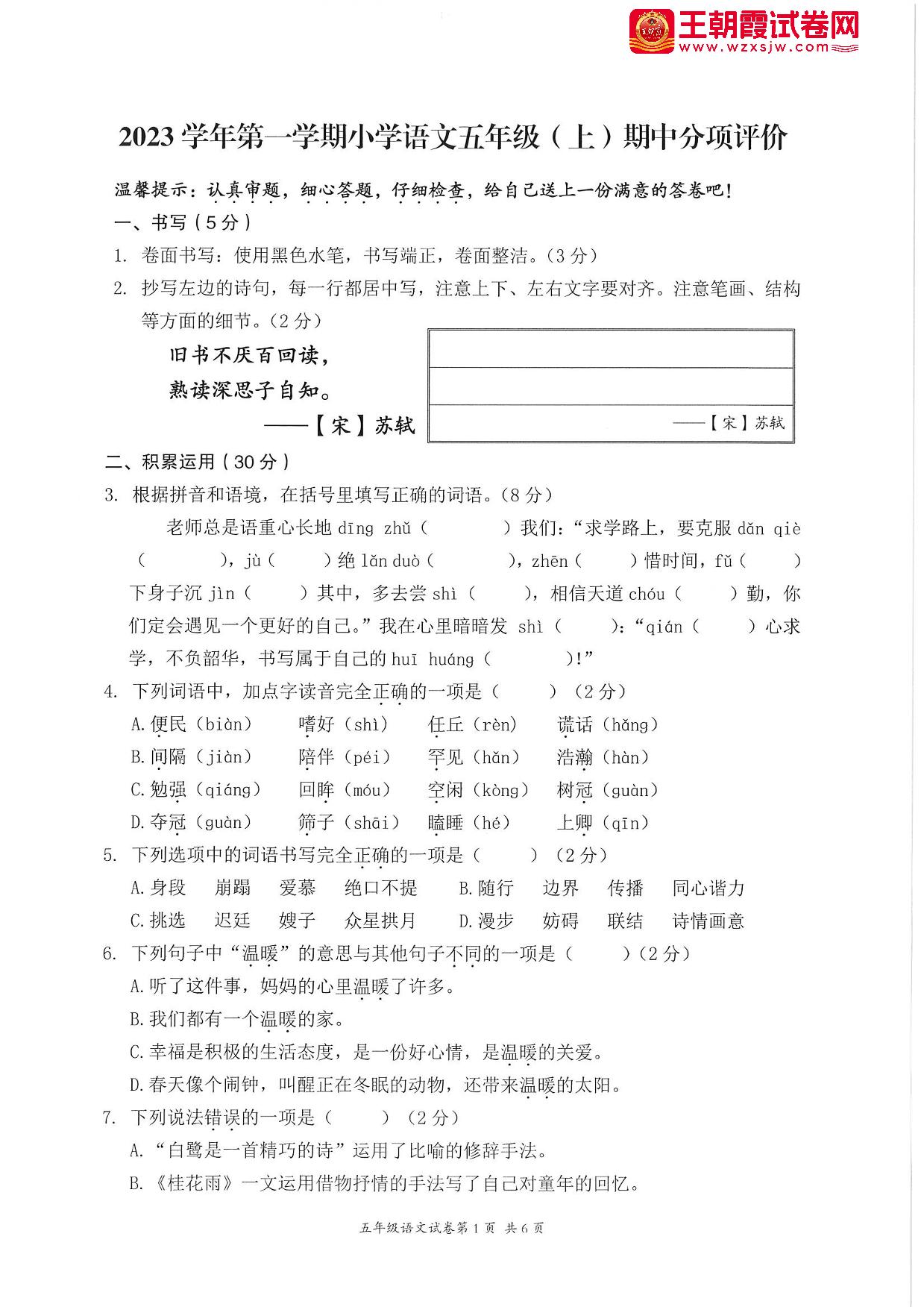 浙江省温州市鹿城区黄龙第一小学2023-2024学年第一学期期中分项评价五年级语文(人教版)