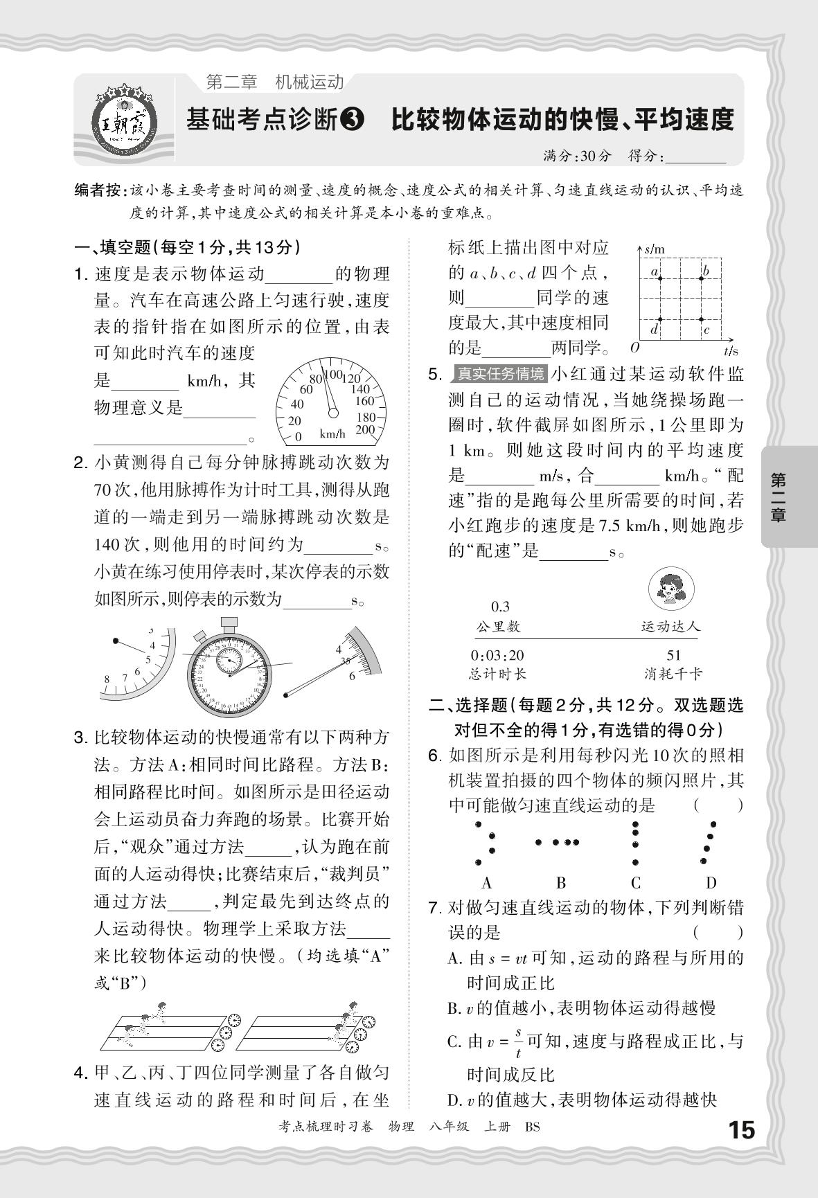 2024秋上册八年级物理北师版 第二章 基础考点诊断3 比较物体运动的快慢、平均速度