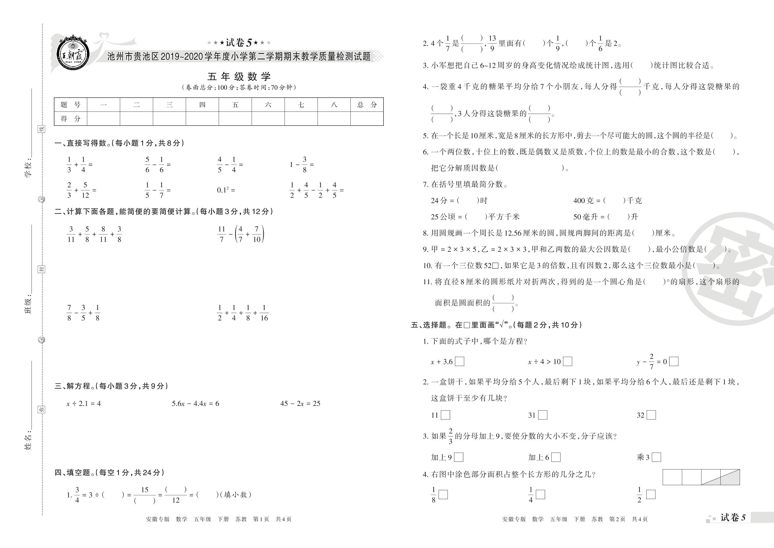 2019-2020学年第二学期池州市贵池市五年级数学试卷(苏教版)【5】