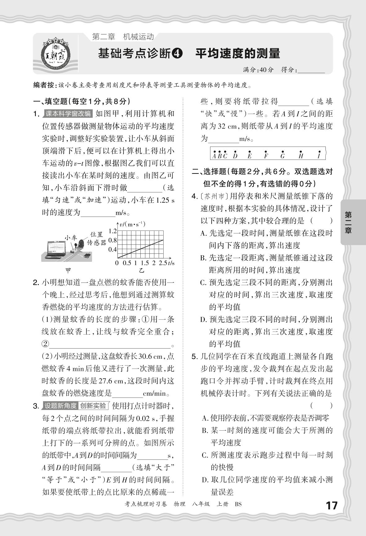 2024秋上册八年级物理北师版 第二章 基础考点诊断4 平均速度的测量
