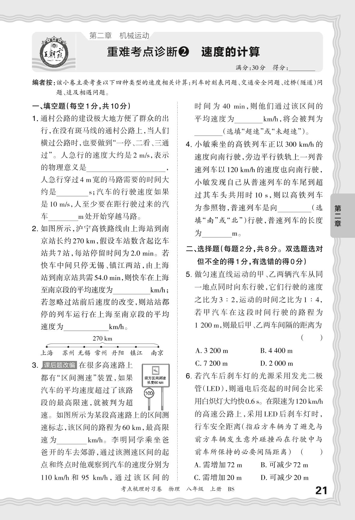 2024秋上册八年级物理北师版 第二章 重难考点诊断2 速度的计算
