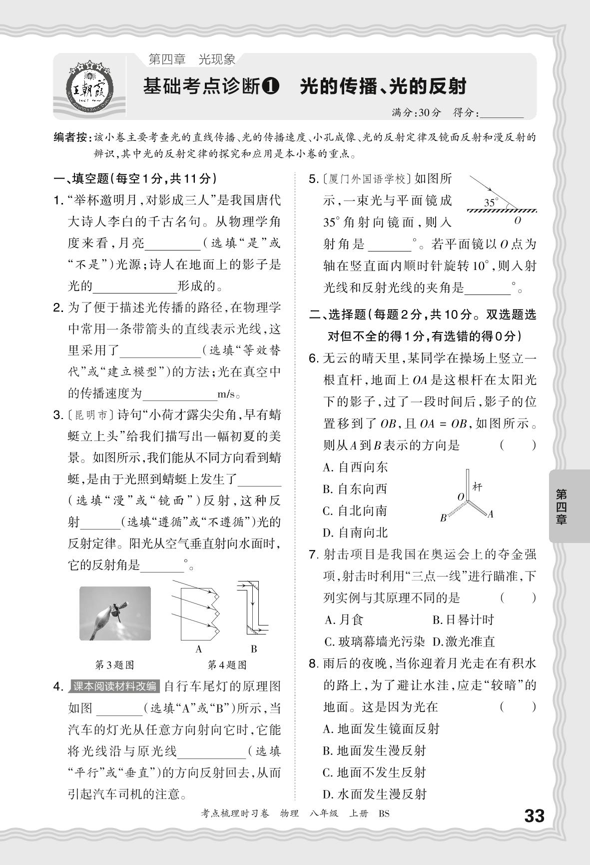 2024秋上册八年级物理北师版 第四章 基础考点诊断1 光的传播、光的反射