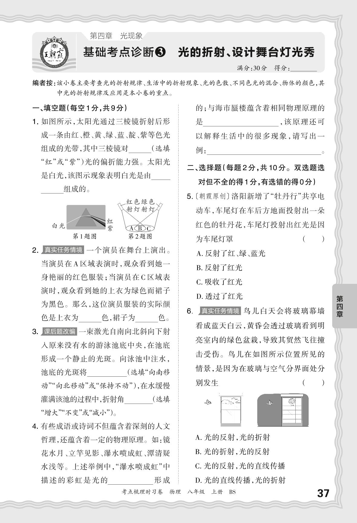 2024秋上册八年级物理北师版 第四章 基础考点诊断3 光的折射、设计舞台灯光秀