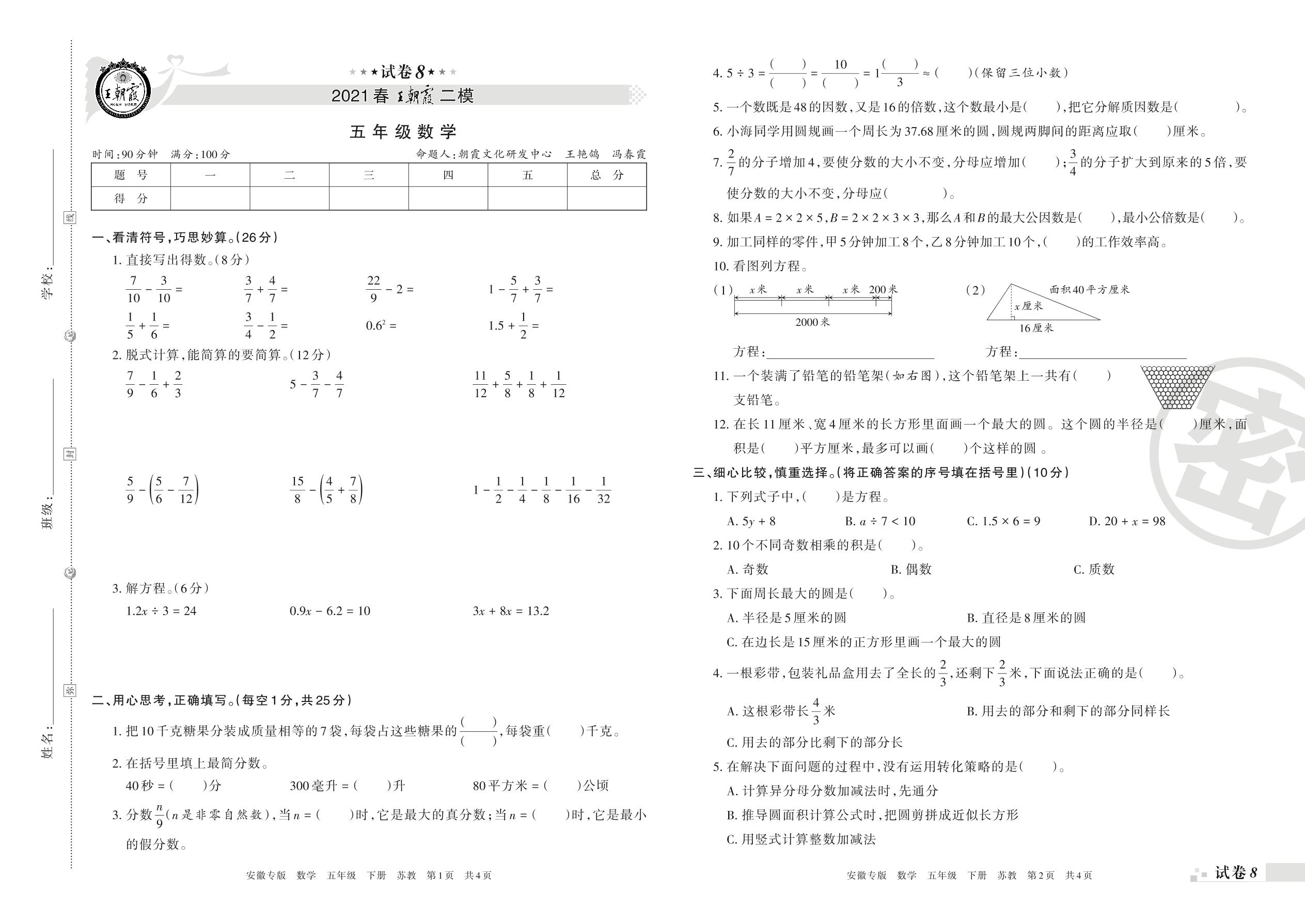 王朝霞期末模拟卷五年级下册数学(苏教版)_R210804162645【8】