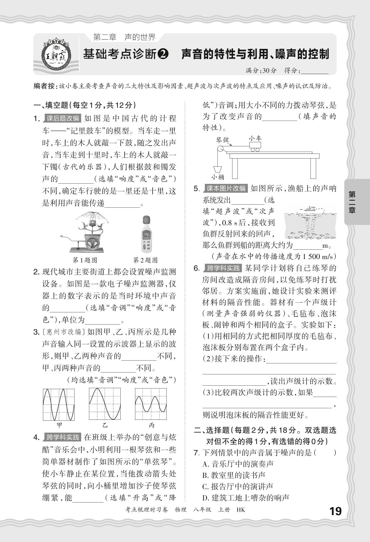 2024秋上册八年级物理沪科版 第二章 基础考点诊断2 声音的特性与利用、噪声的控制