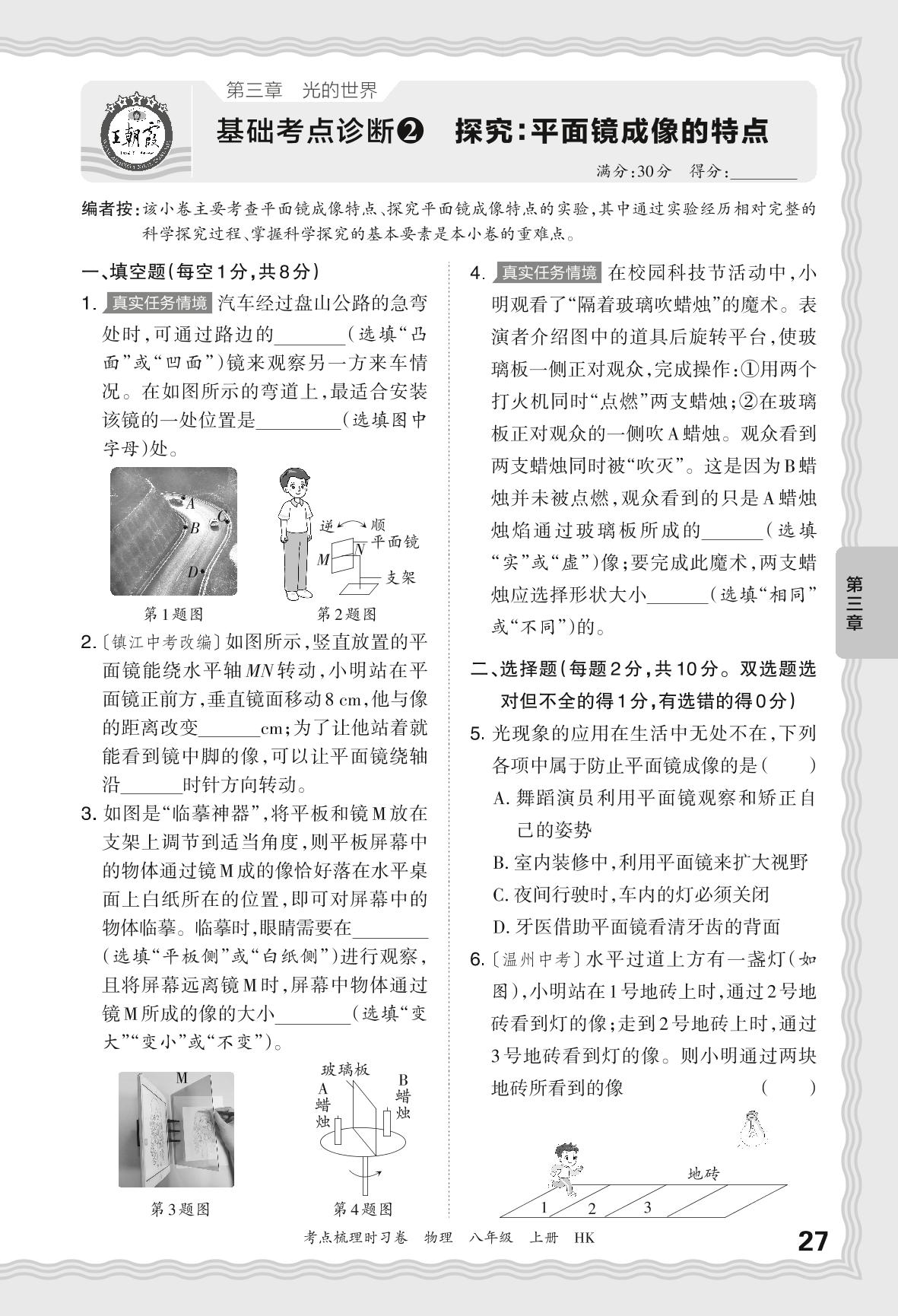 2024秋上册八年级物理沪科版 第三章 基础考点诊断2 探究:平面镜成像的特点