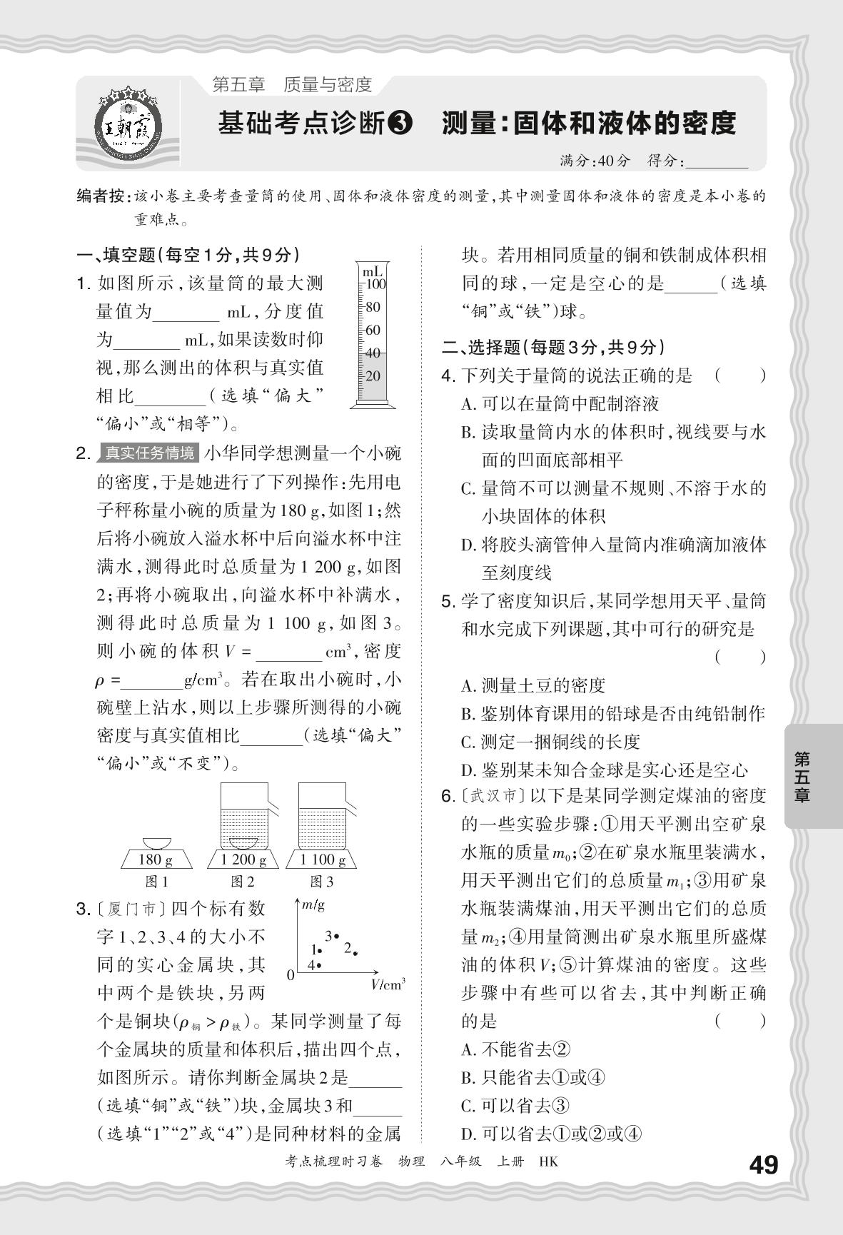 2024秋上册八年级物理沪科版 第五章 基础考点诊断3 测量:固体和液体的密度
