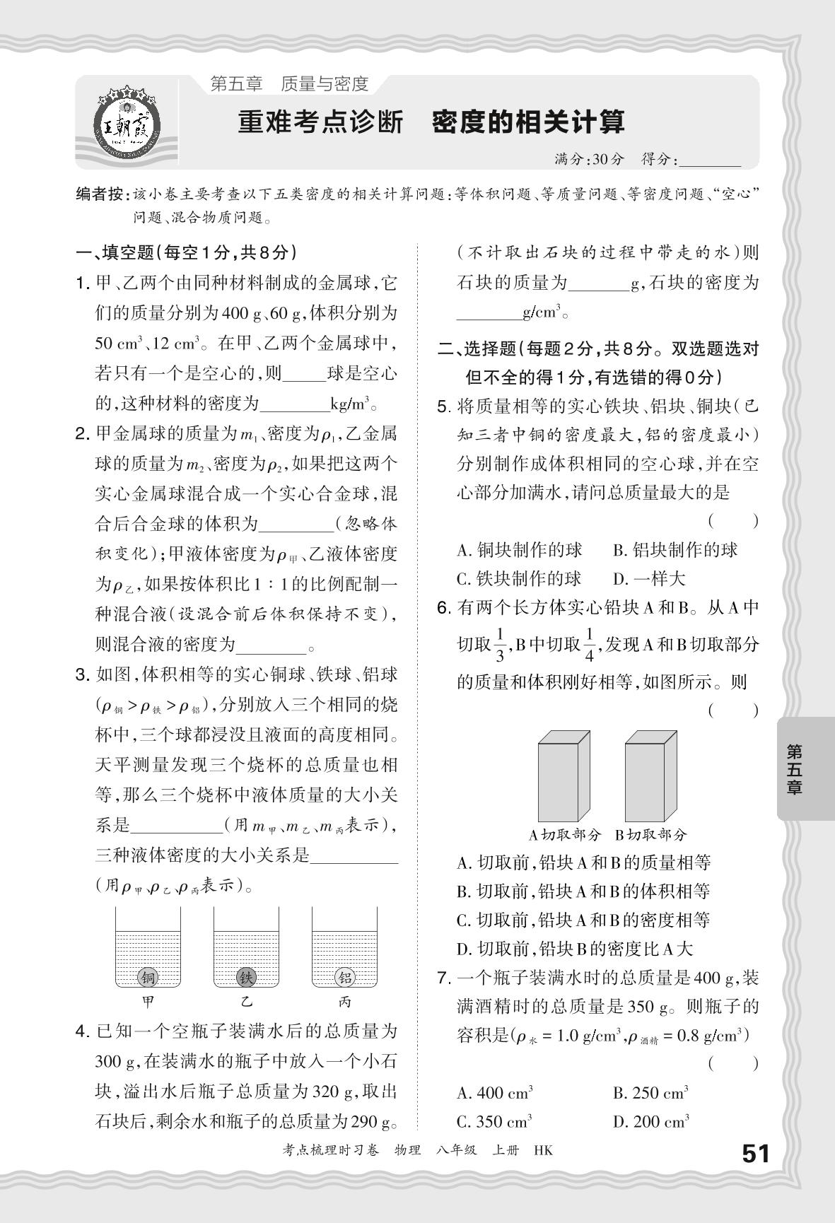 2024秋上册八年级物理沪科版 第五章 重难考点诊断 密度的相关计算