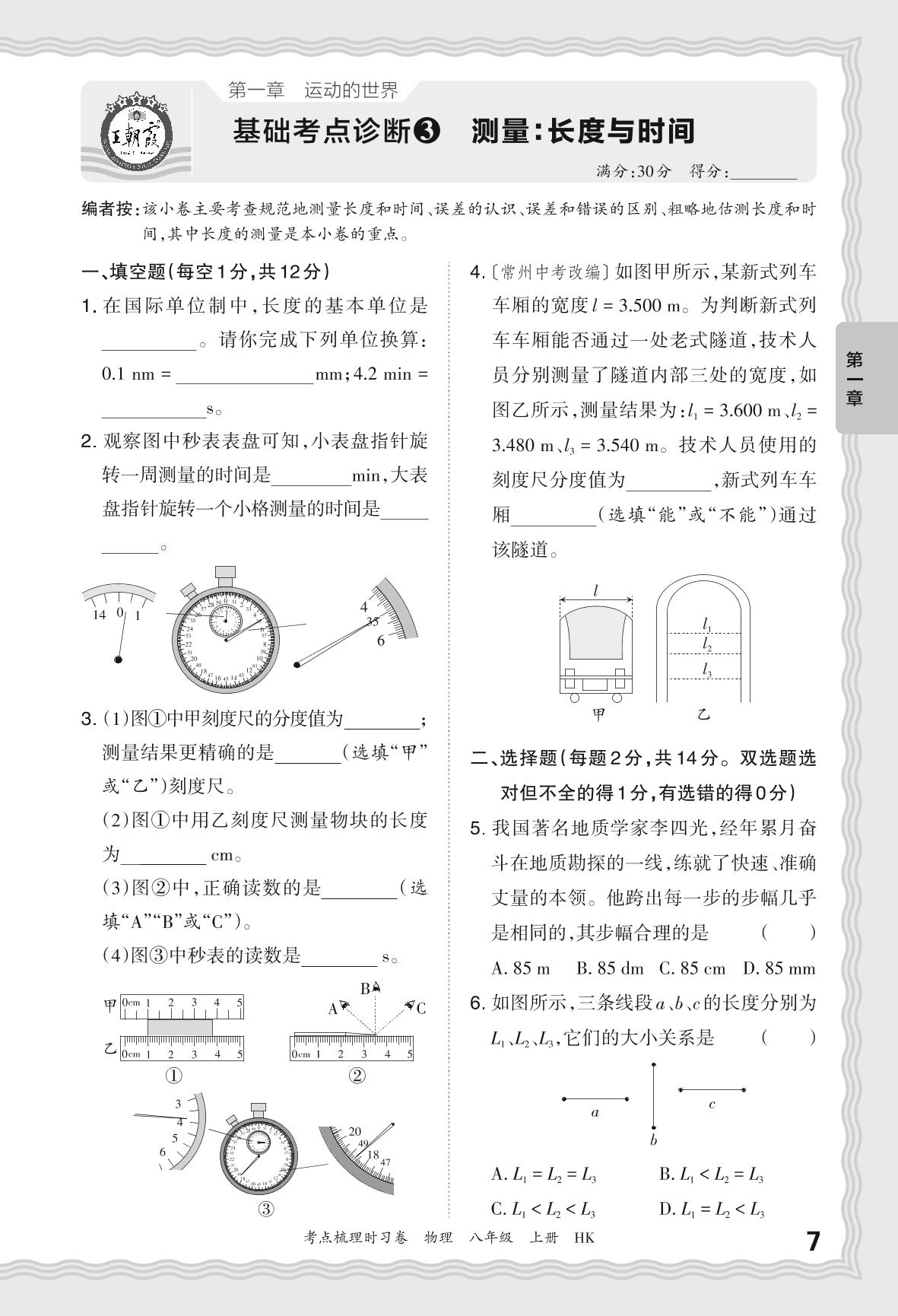 2024秋上册八年级物理沪科版 第一章 基础考点诊断3 测量:长度与时间