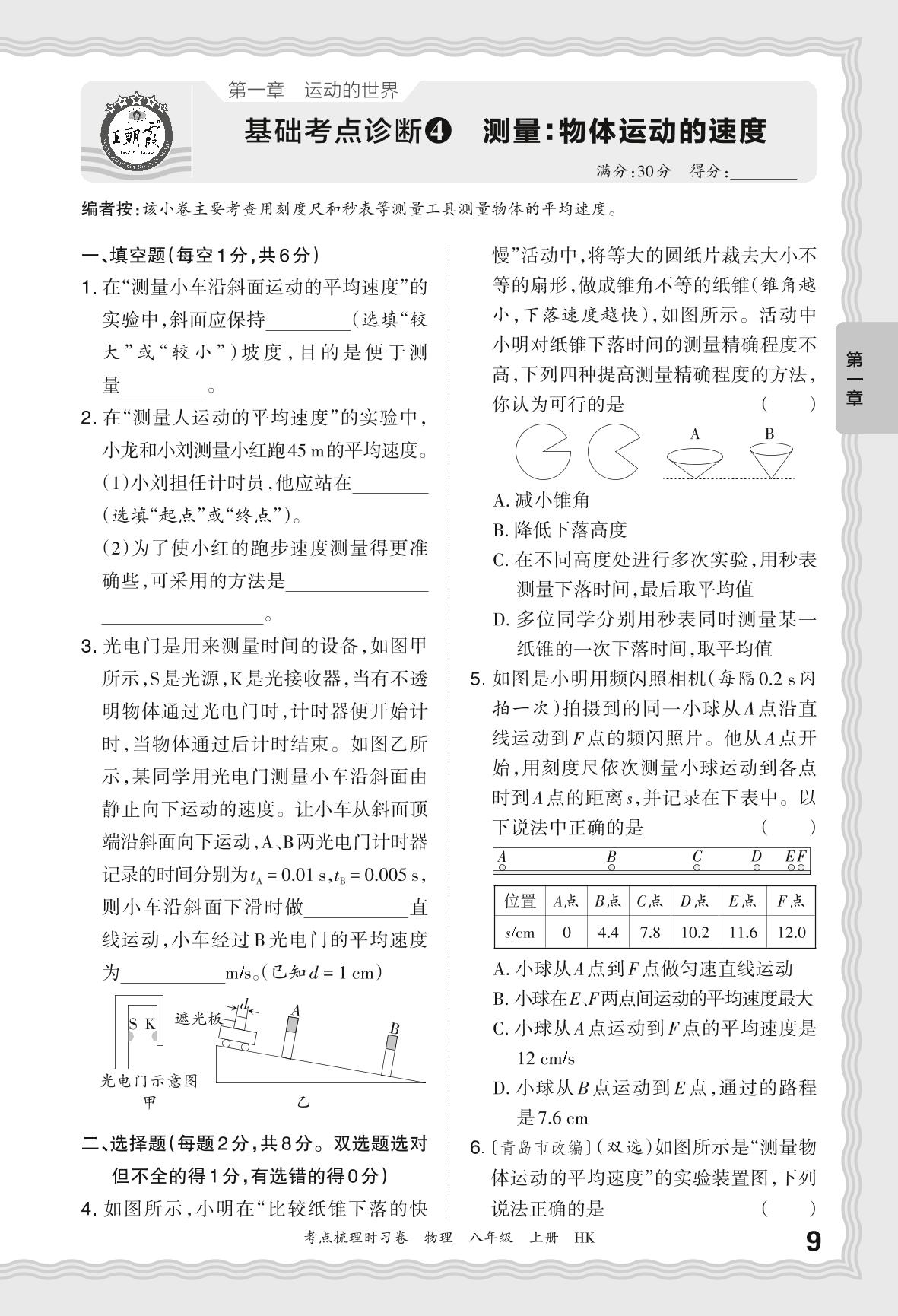 2024秋上册八年级物理沪科版 第一章 基础考点诊断4 测量:物体运动的速度