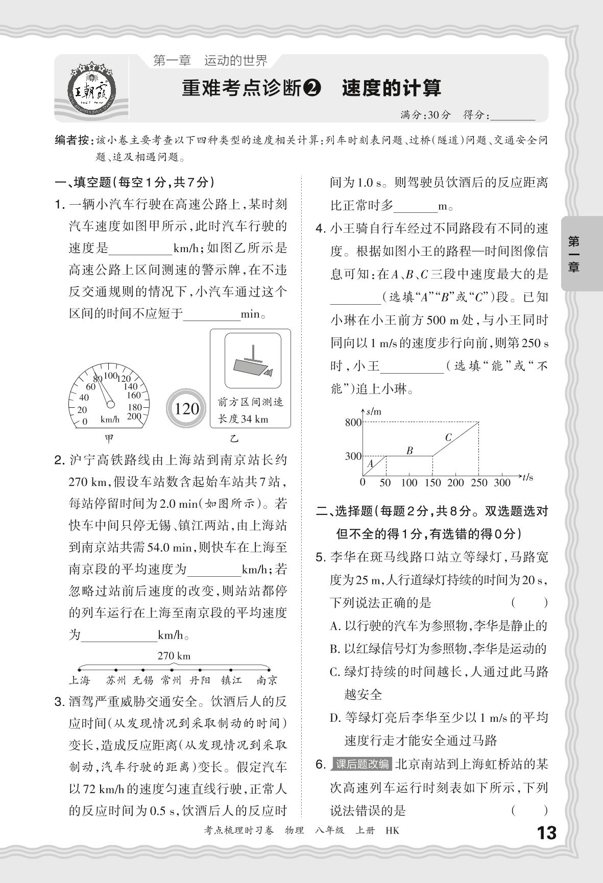 2024秋上册八年级物理沪科版 第一章 重难考点诊断2 速度的计算