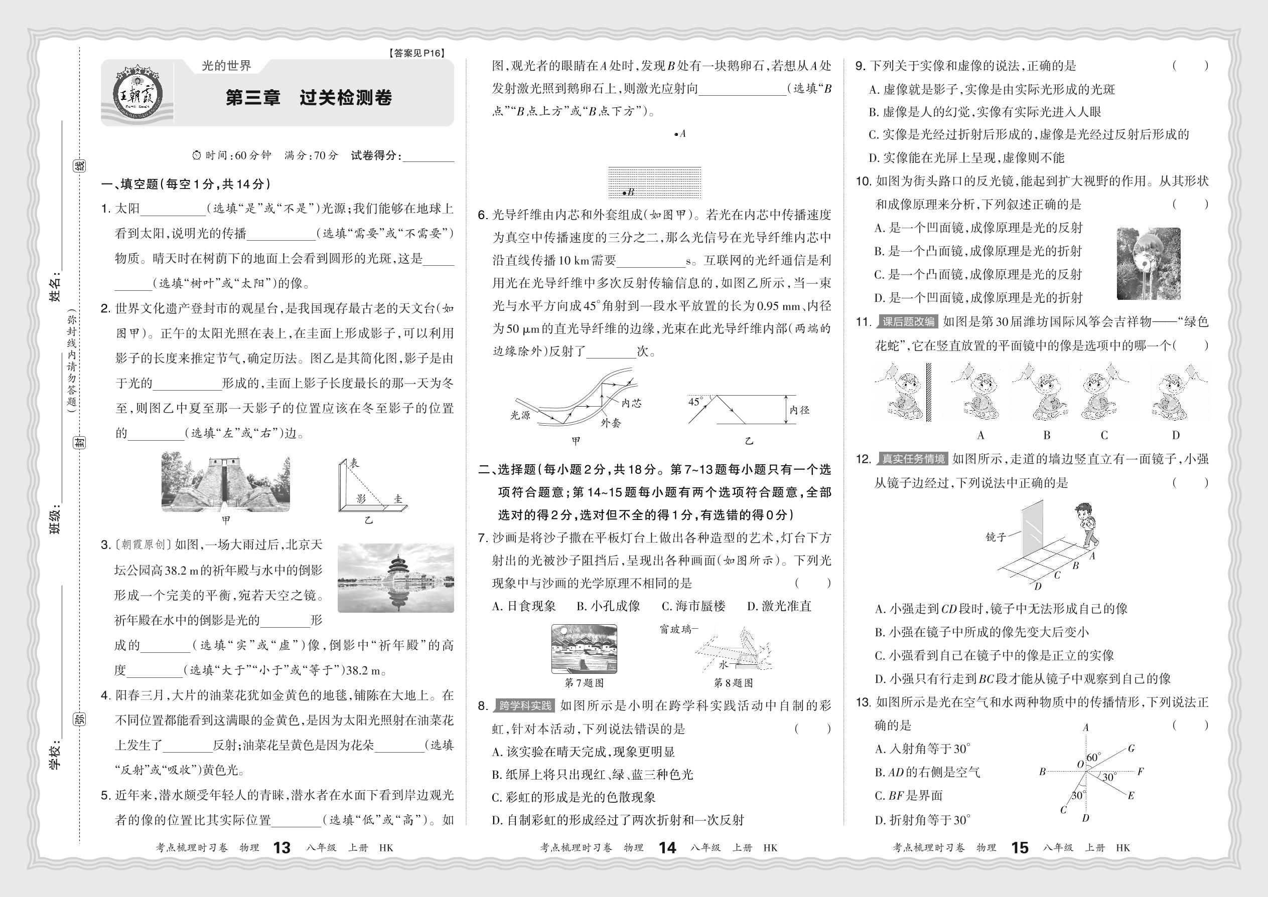 2024秋上册八年级物理沪科版 第三章 过关检测卷