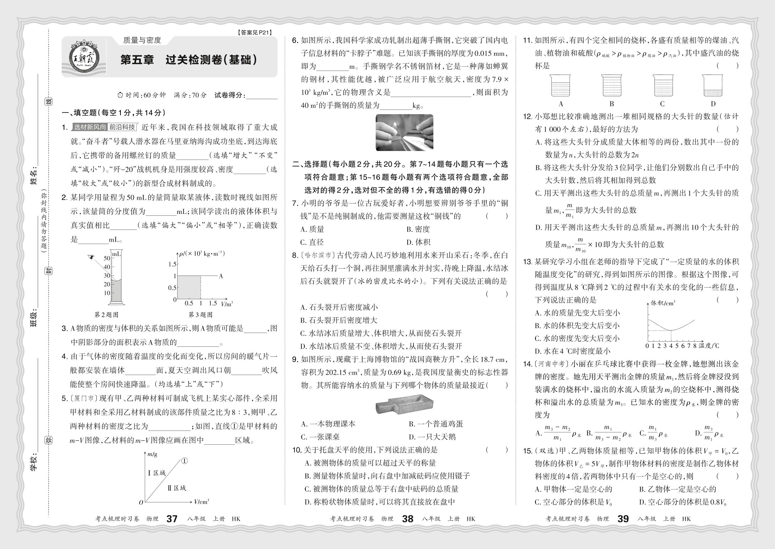 八年级物理沪科版(2024)全一册单元卷