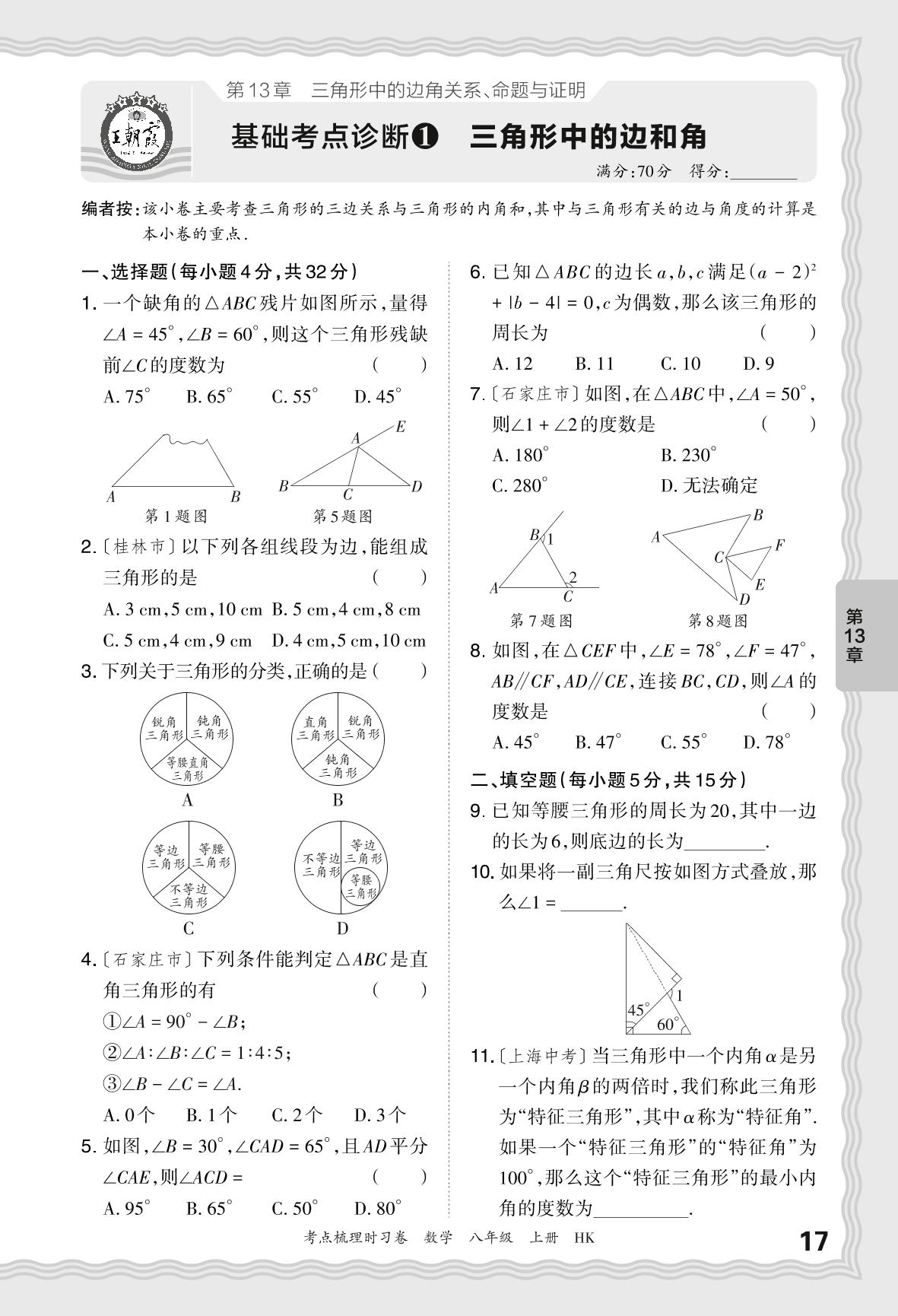 2024秋上册八年级数学沪科版 第13章 基础考点诊断 三角形中的边和角【1】