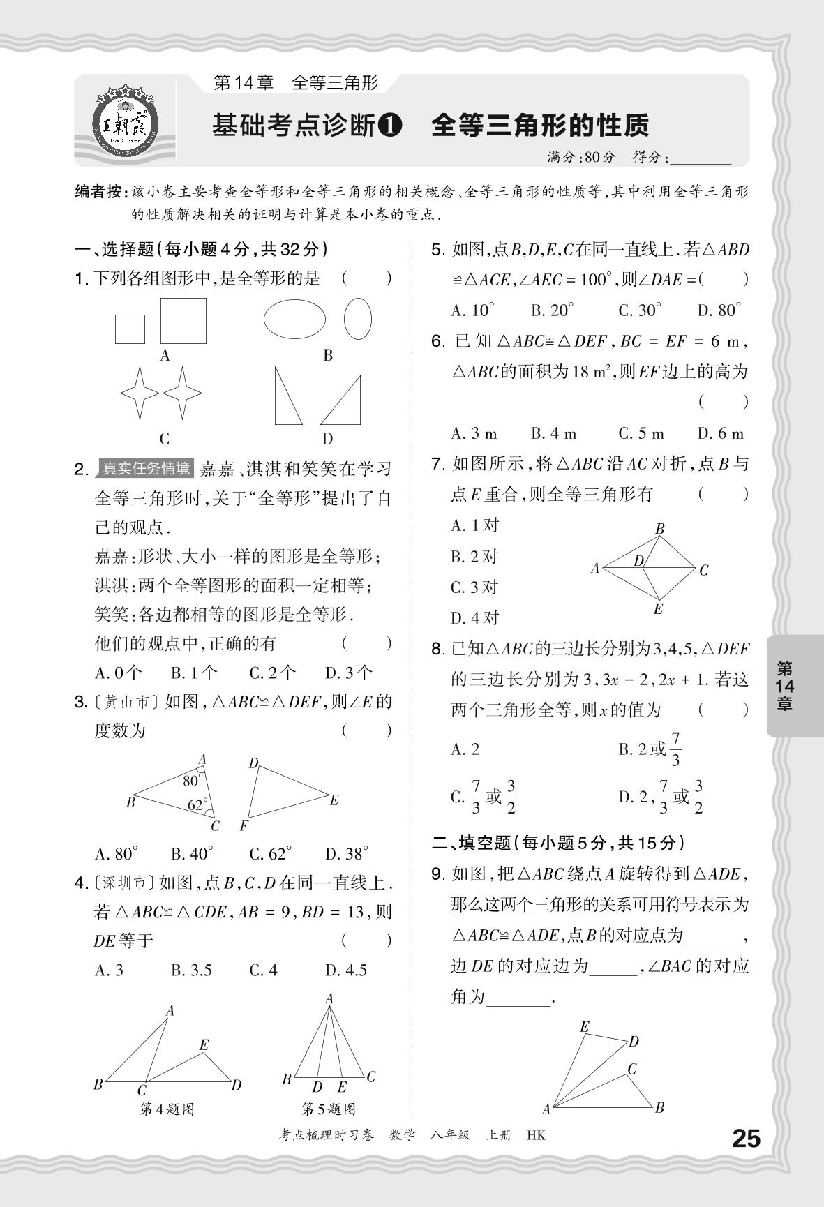 2024秋上册八年级数学沪科版 第14章 基础考点诊断 全等三角形的性质【1】