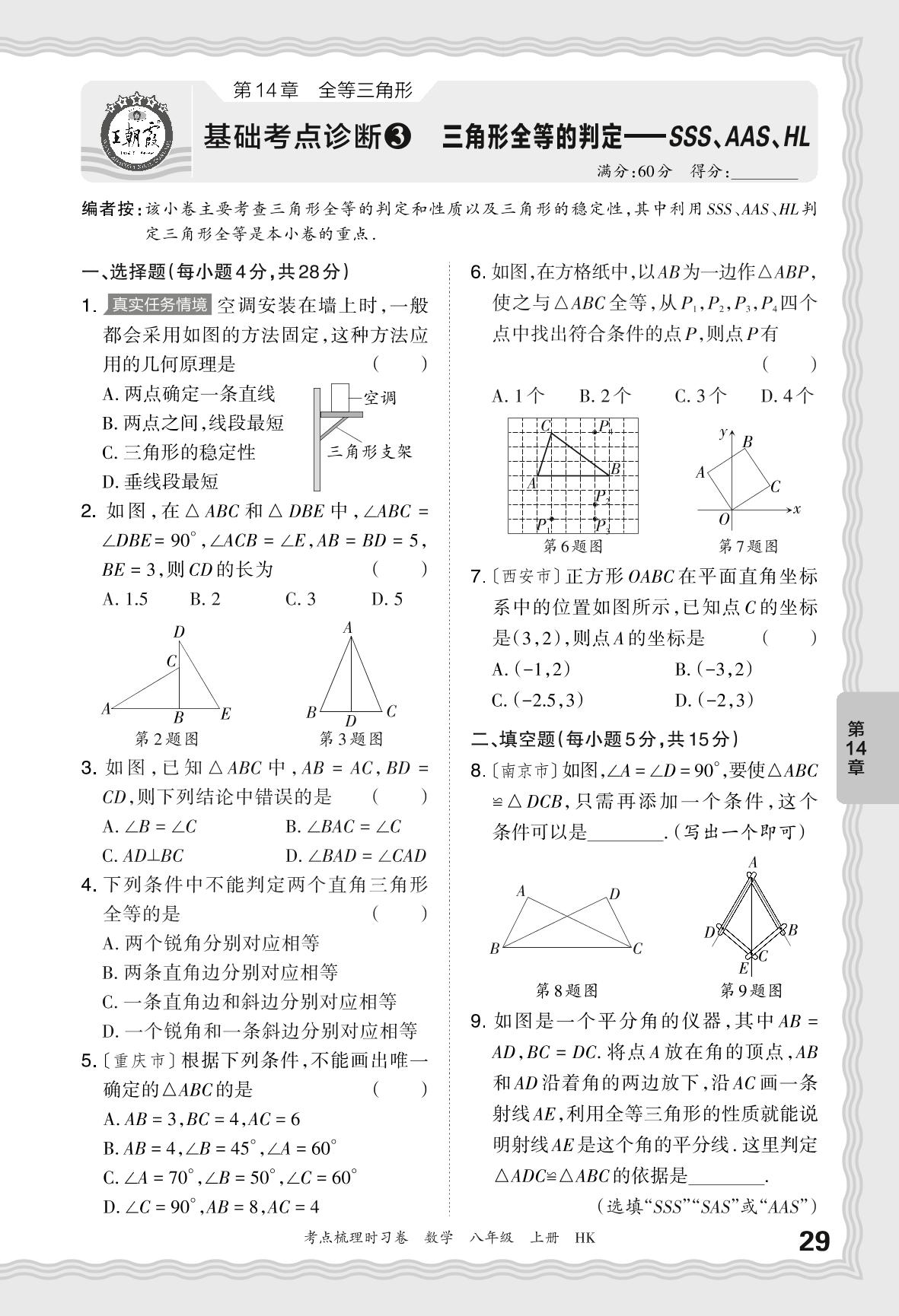 2024秋上册八年级数学沪科版 第14章 基础考点诊断 三角形全等的判定——SSS、AAS、HL【3】