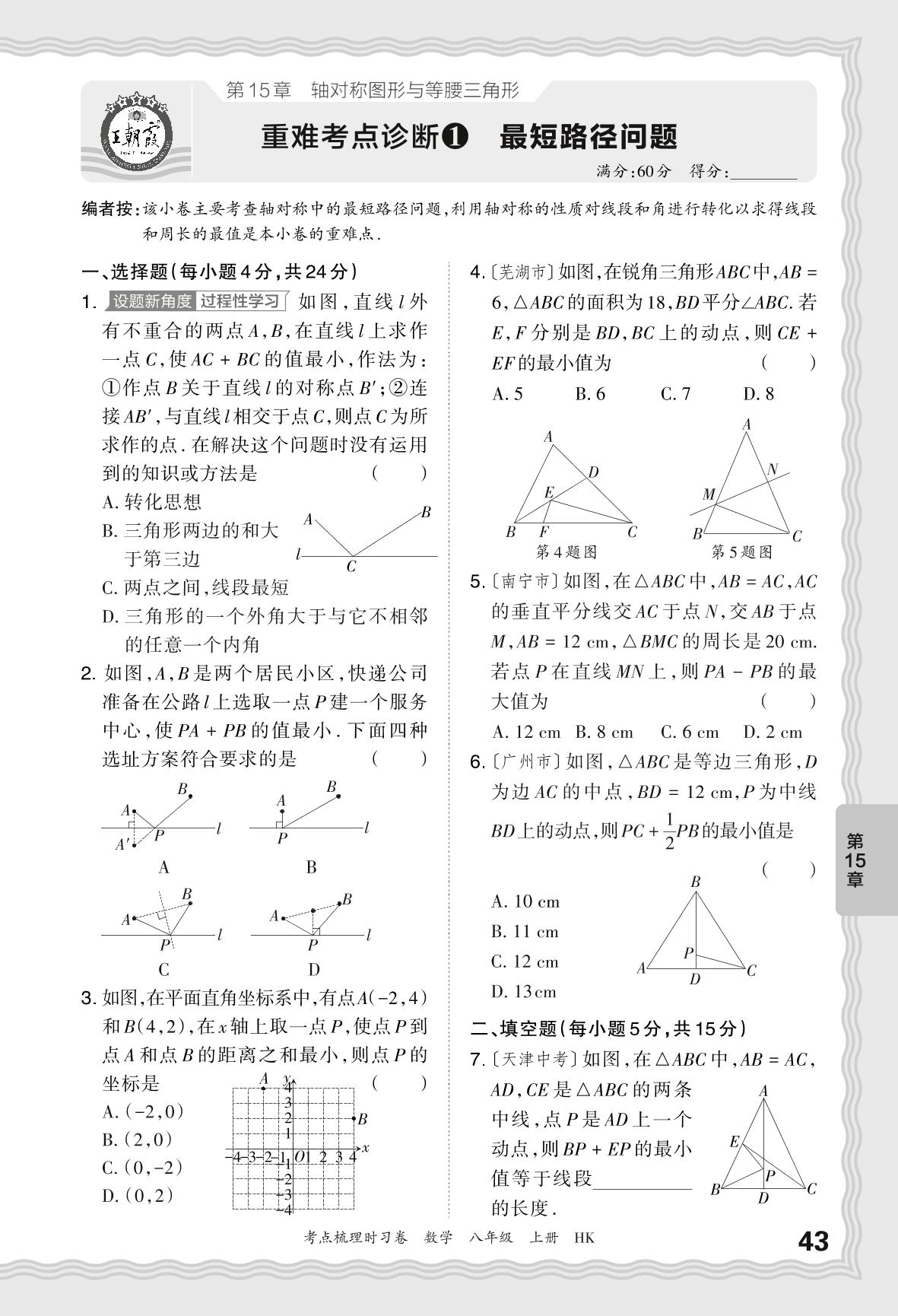 2024秋上册八年级数学沪科版 第15章 重难考点诊断 最短路径问题【1】
