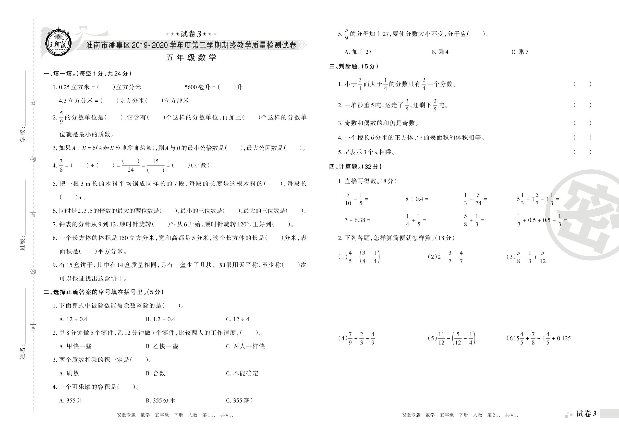 2019-2020学年第二学期淮南市潘集区五年级数学试卷(人教版)【3】