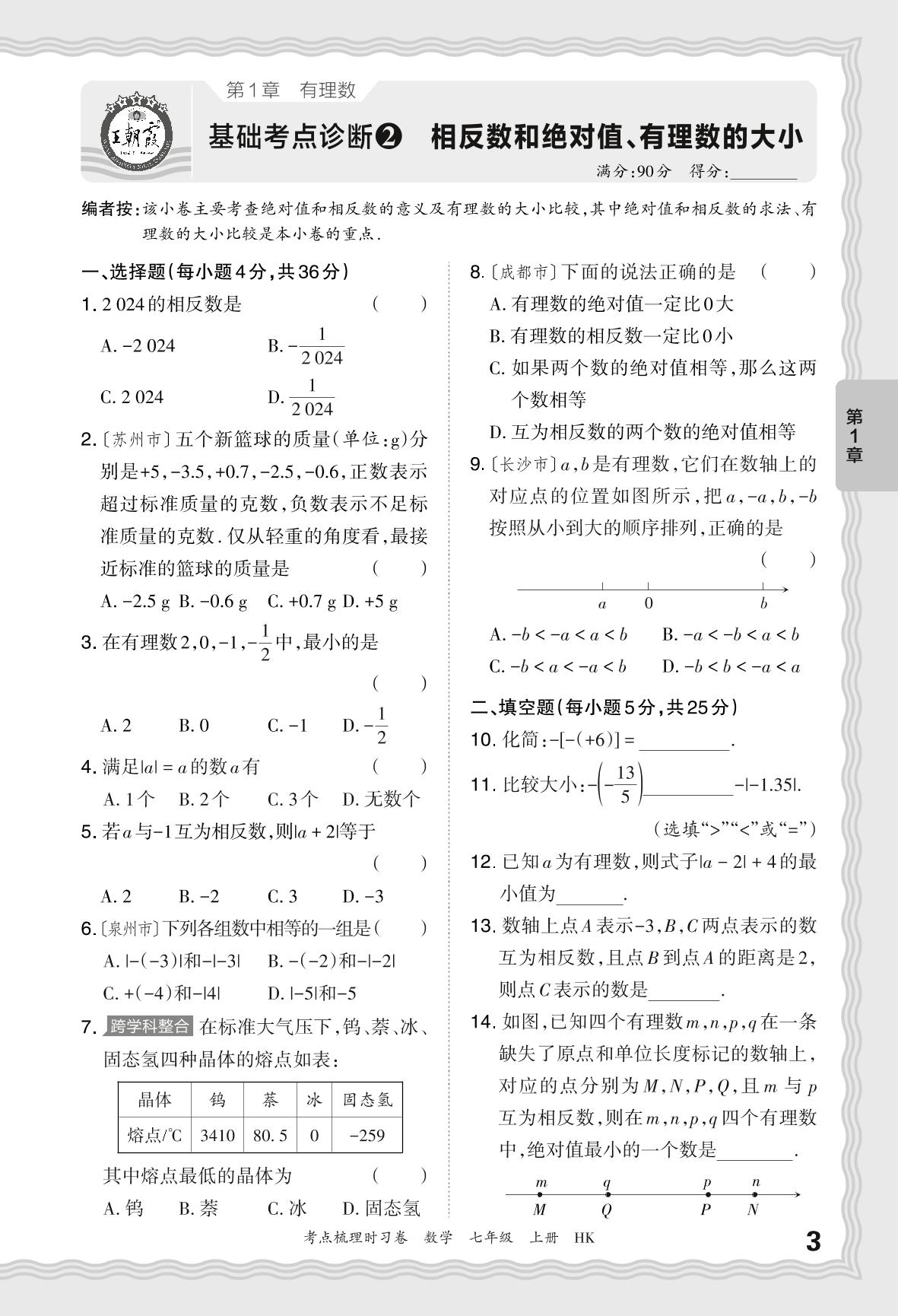 2024秋上册七年级数学沪科版 第1章 基础考点诊断 相反数和绝对值、有理数的大小【2】