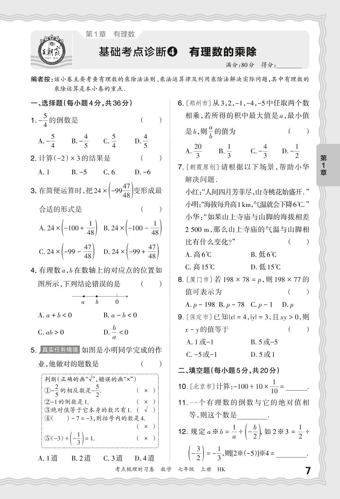 2024秋上册七年级数学沪科版 第1章 基础考点诊断 有理数的乘除【4】