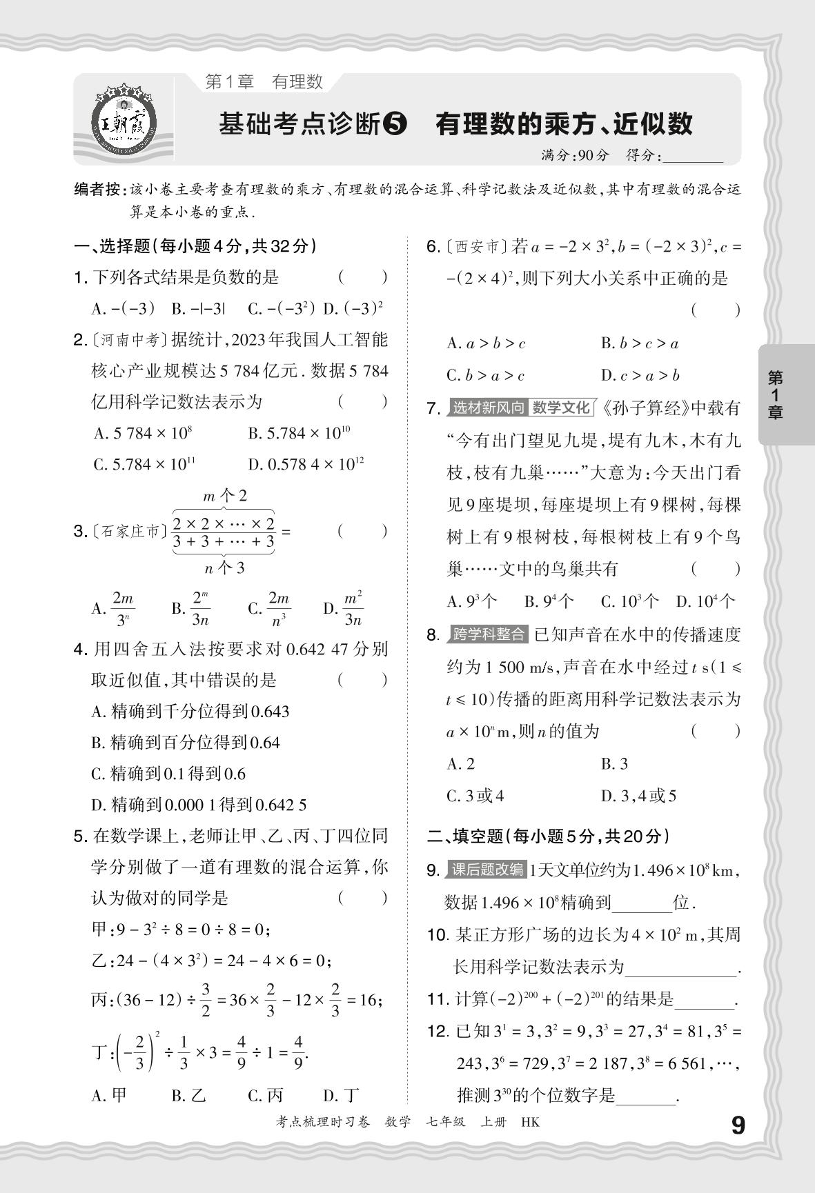 2024秋上册七年级数学沪科版 第1章 基础考点诊断 有理数的乘方、近似数【5】