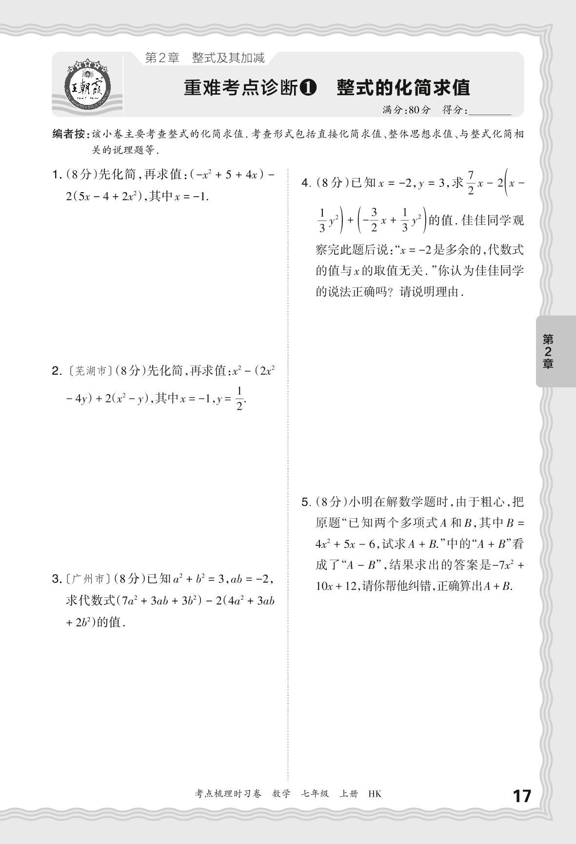 2024秋上册七年级数学沪科版 第2章 重难考点诊断 整式的化简求值【1】