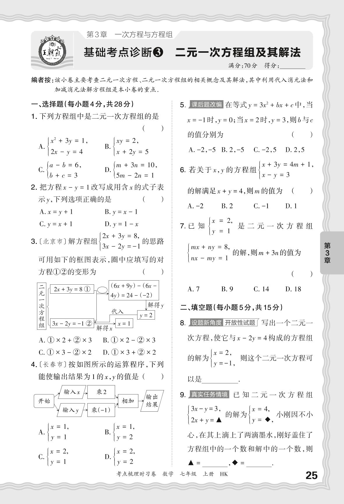 2024秋上册七年级数学沪科版 第3章 基础考点诊断 二元一次方程组及其解法【3】