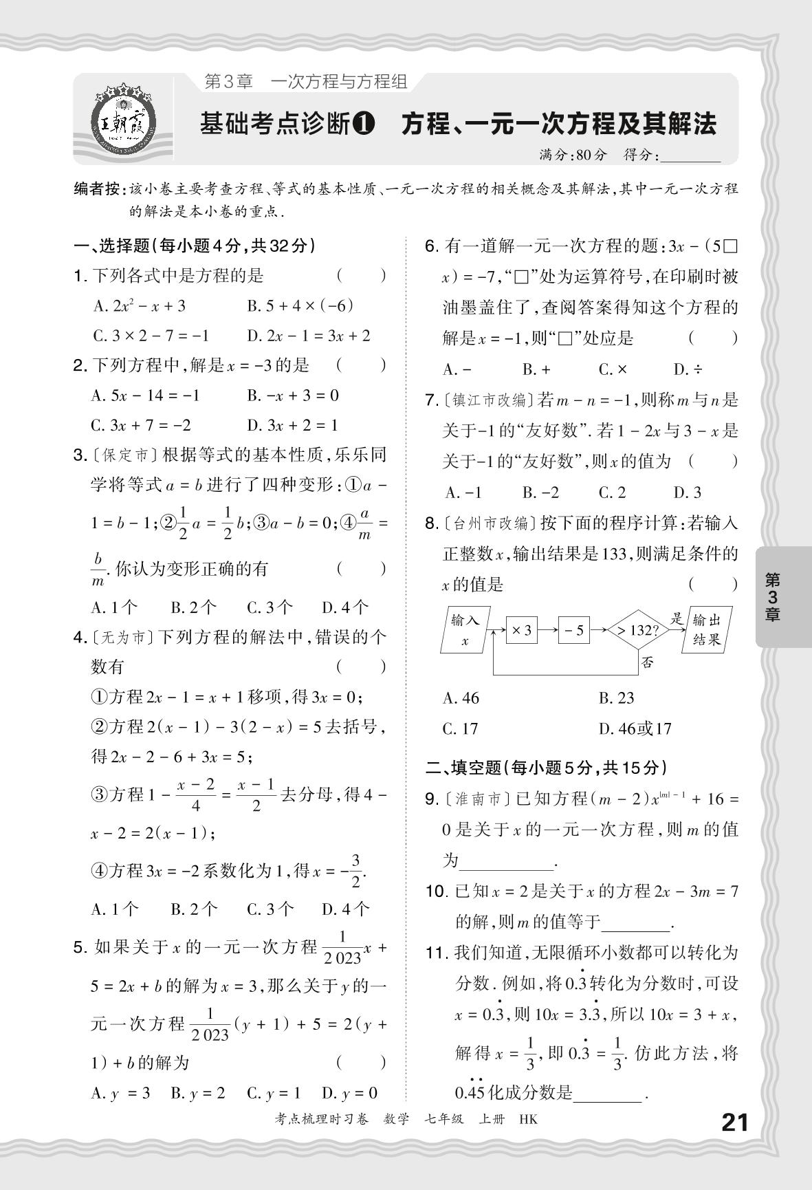 2024秋上册七年级数学沪科版 第3章 基础考点诊断 方程、一元一次方程及其解法【1】