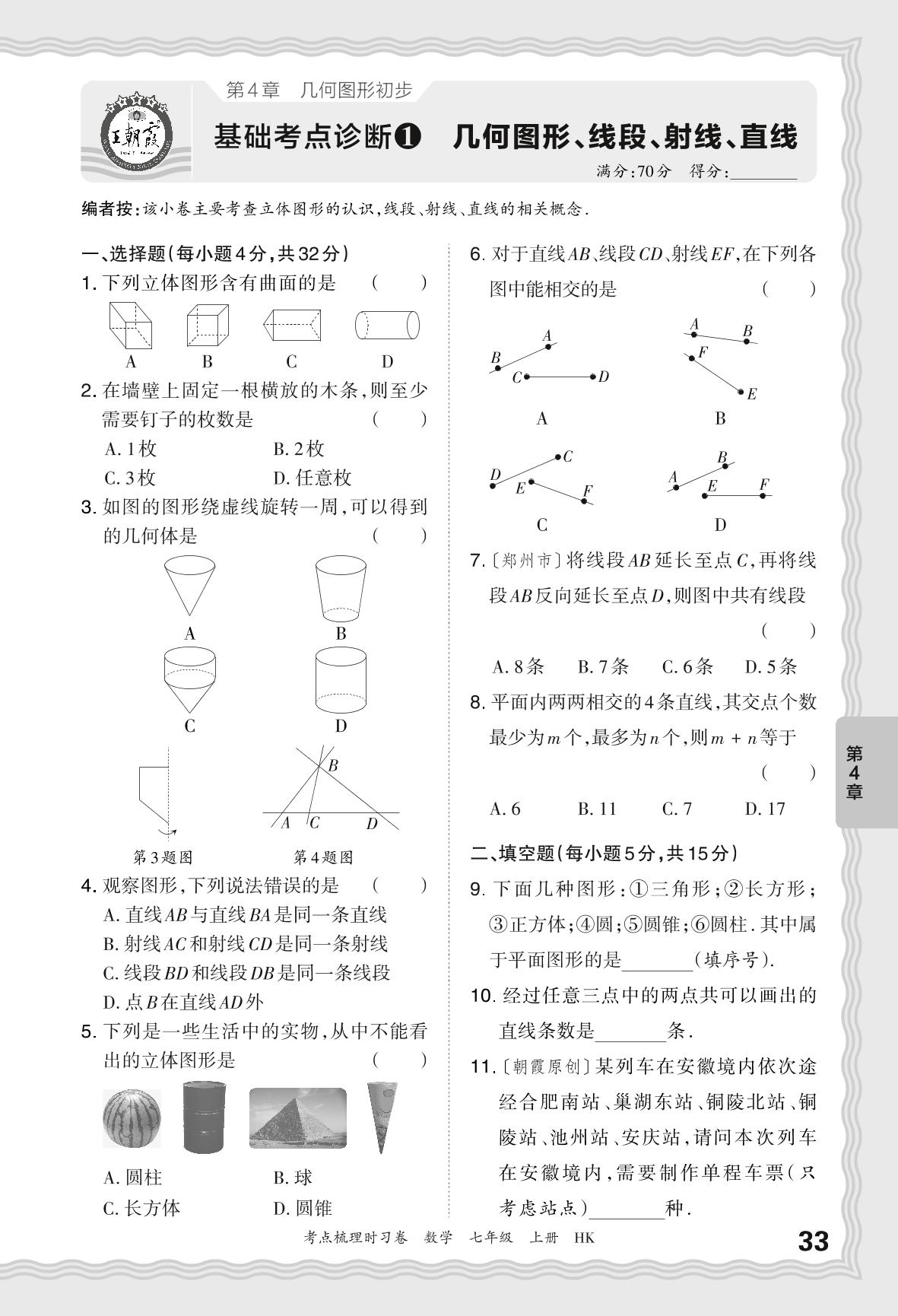 2024秋上册七年级数学沪科版 第4章 基础考点诊断 几何图形、线段、射线、直线【1】