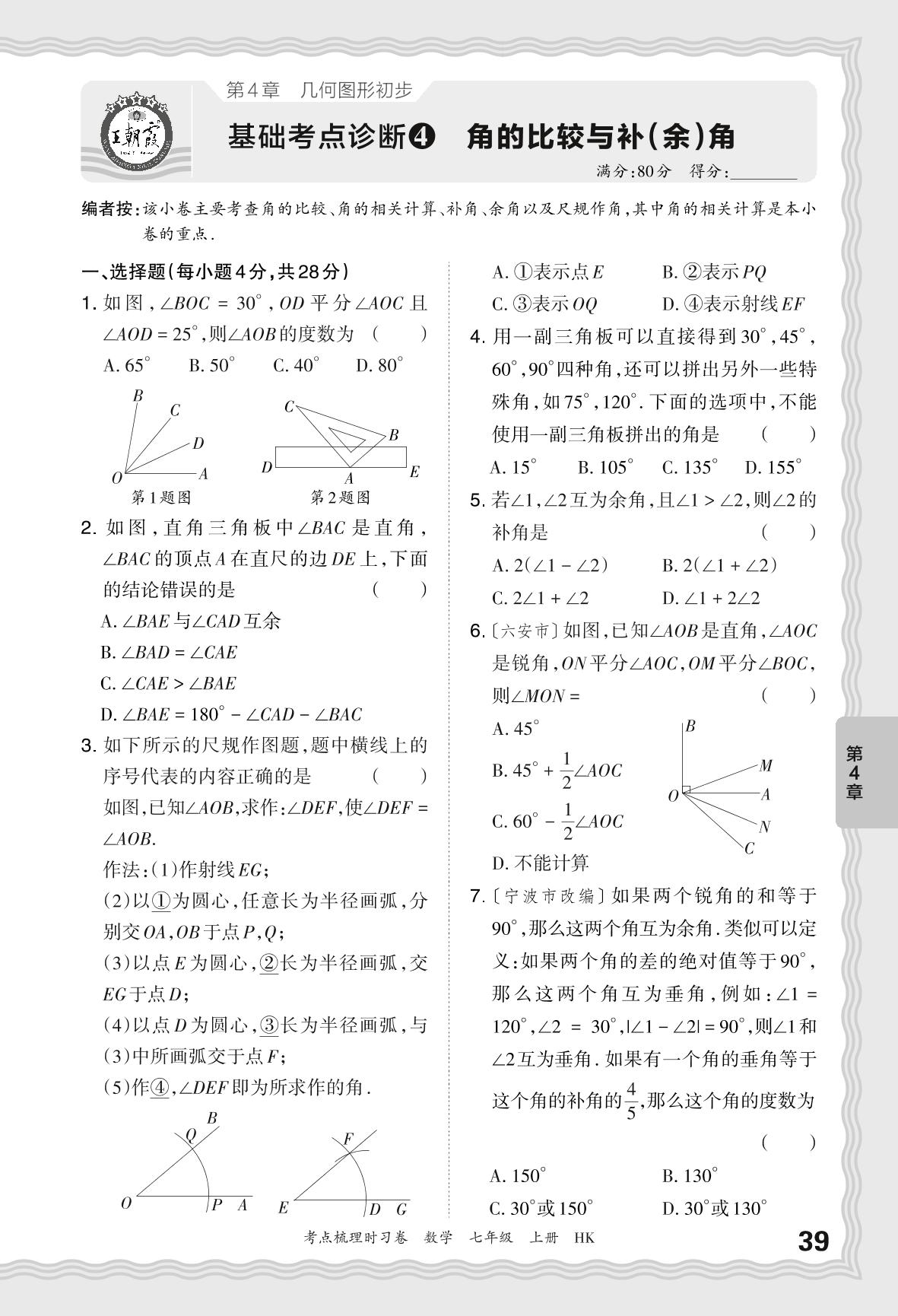 2024秋上册七年级数学沪科版 第4章 基础考点诊断 角的比较与补(余)角【4】