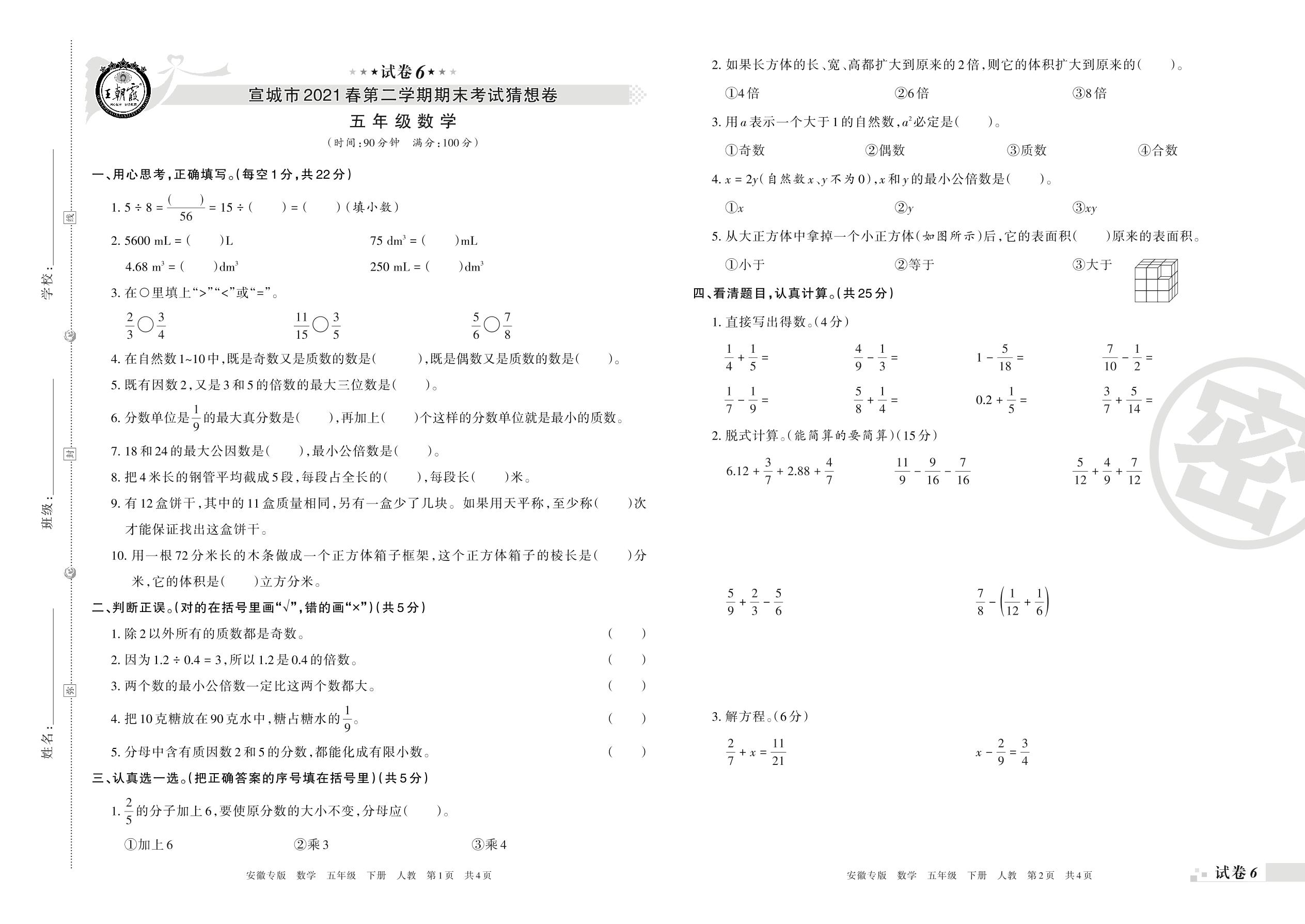 2020-2021学年第二学期宣城市五年级数学试卷(人教版)【6】