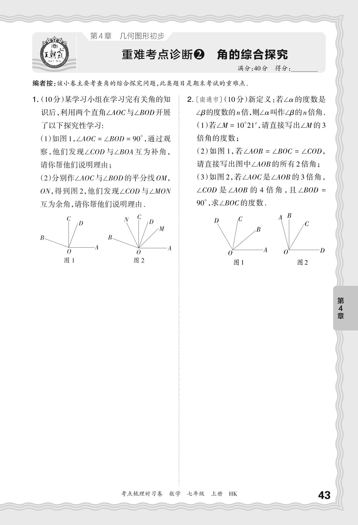 2024秋上册七年级数学沪科版 第4章 重难考点诊断 角的综合探究【2】