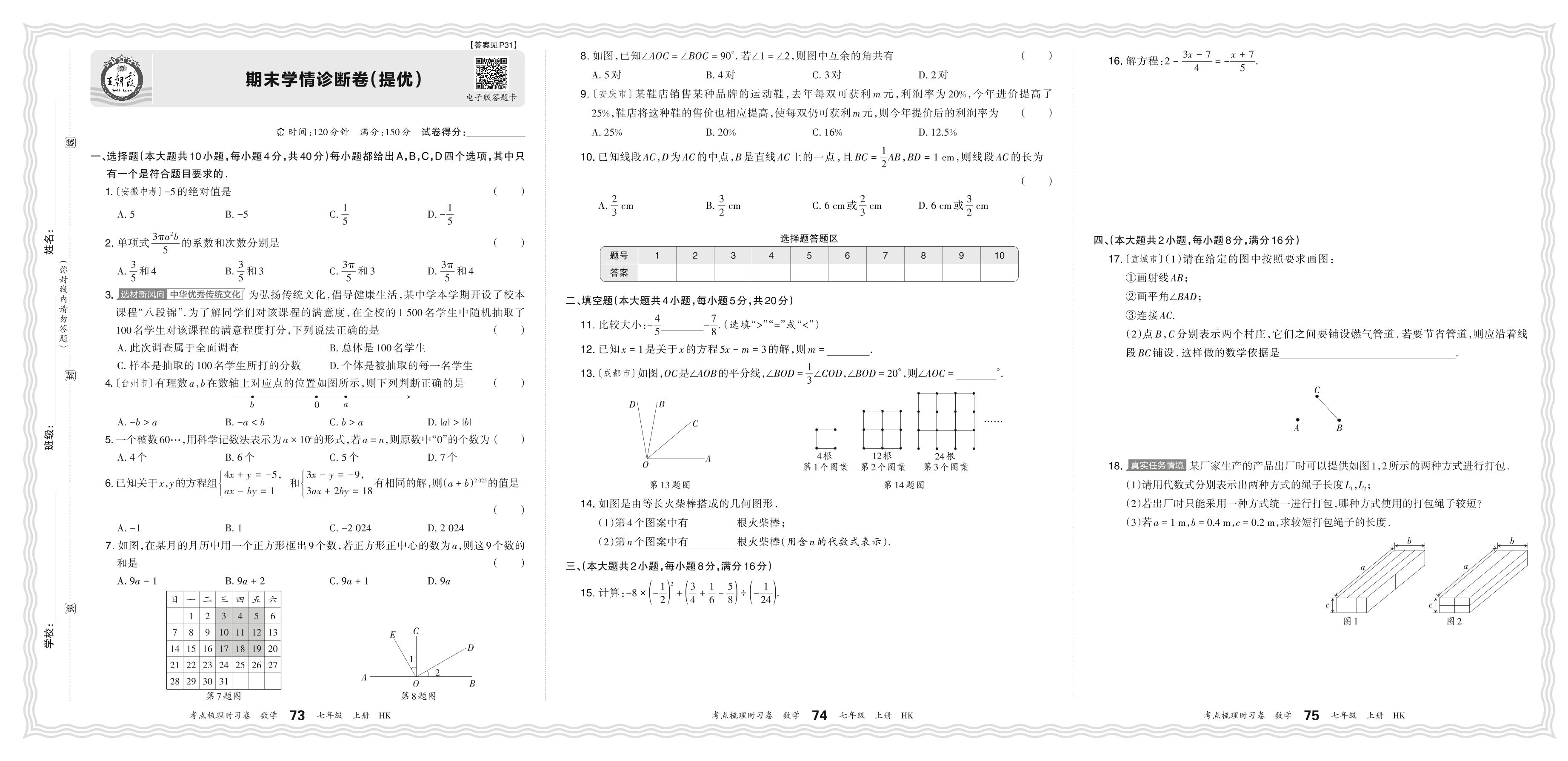 七年级数学沪科版(2024)上册期末卷