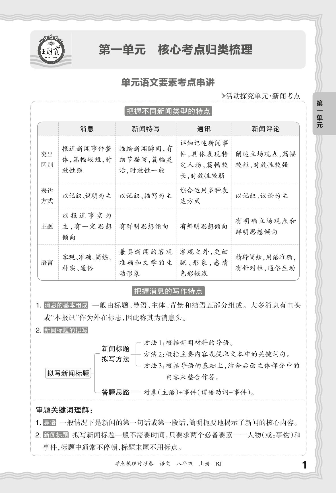 2024秋上册八年级语文人教版 考点梳理手册——第一单元 核心考点归类梳理