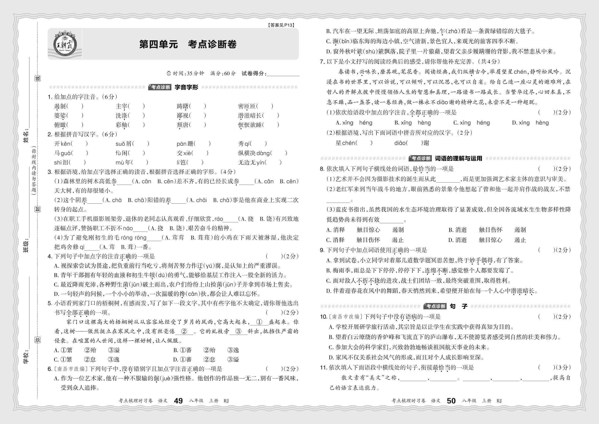 2024秋上册八年级语文人教版 第四单元 考点诊断卷