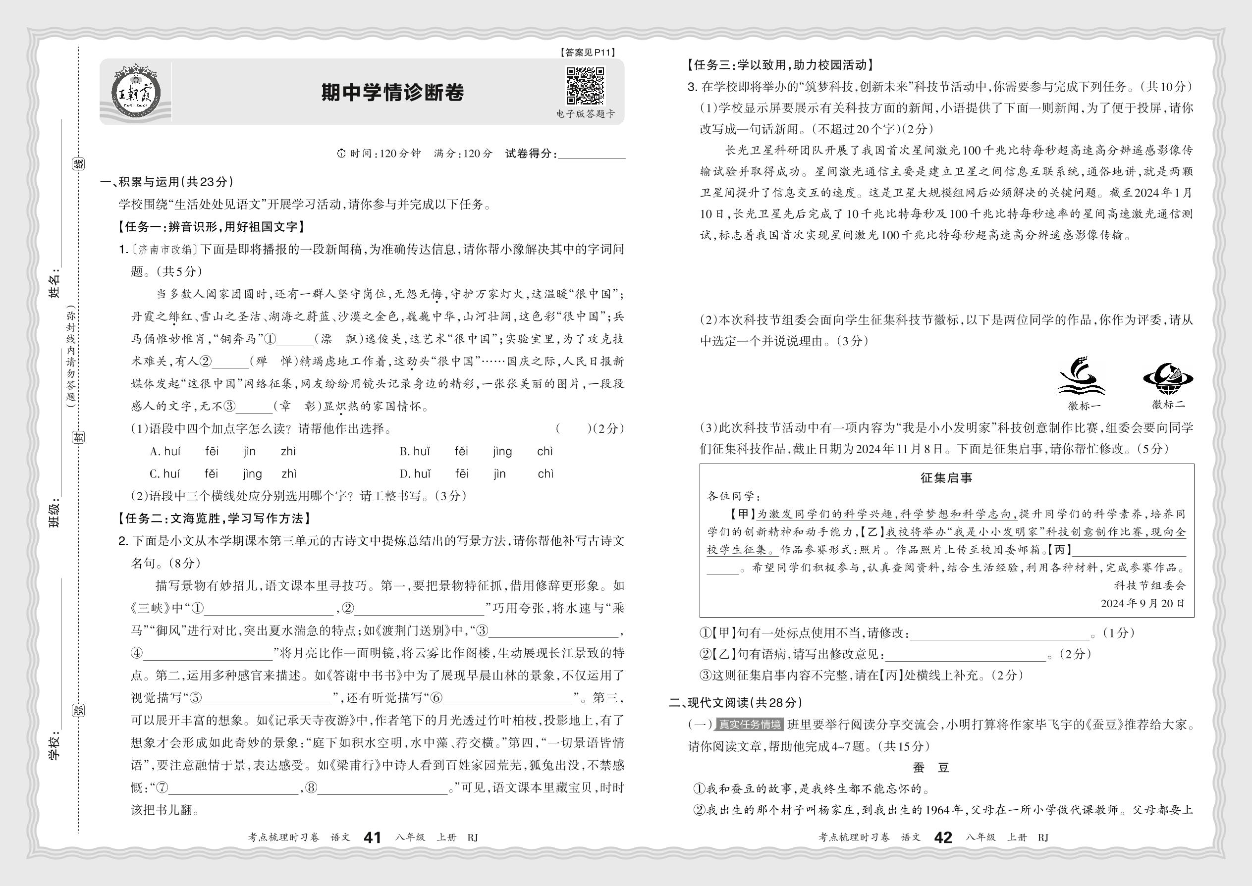2024秋上册八年级语文人教版 期中学情诊断卷
